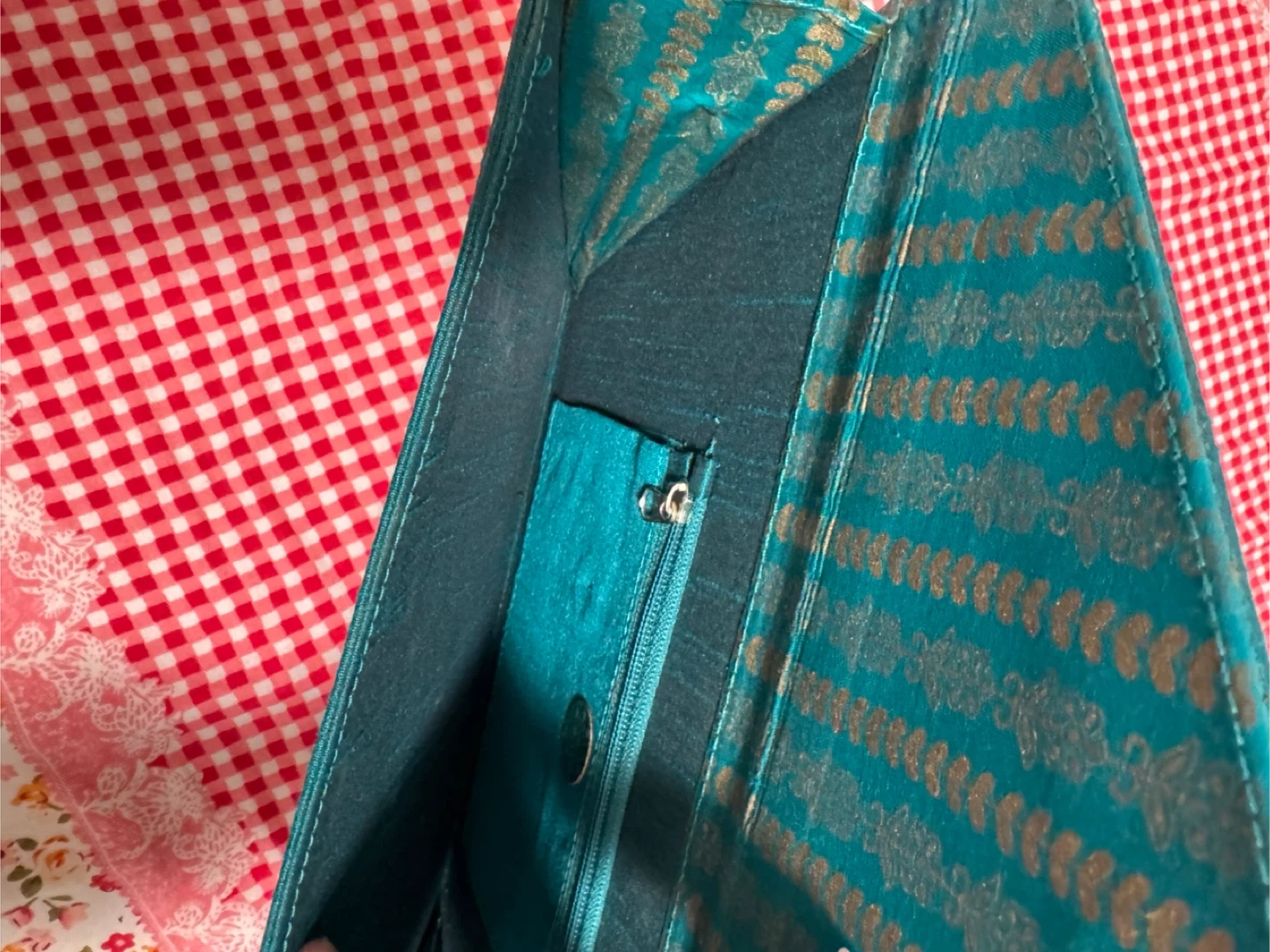 Teal clutch purse featuring intricate gold embroidery. It has a satin-like finish and a magnetic snap closure. Inside, there's a zippered pocket for small essentials. This clutch is perfect for adding a touch of elegance to evening wear!
