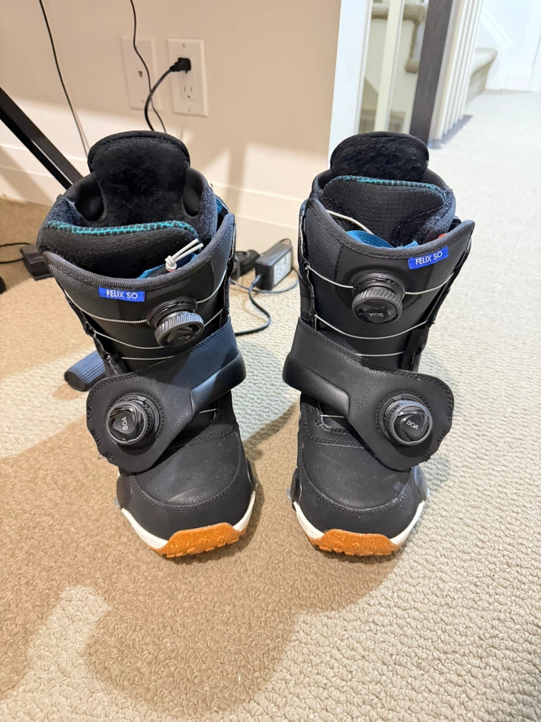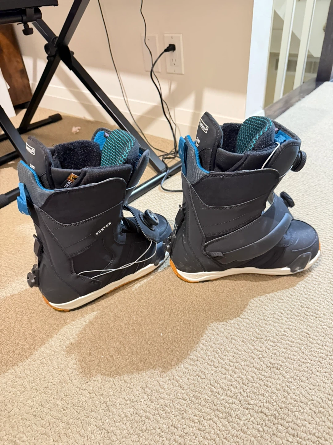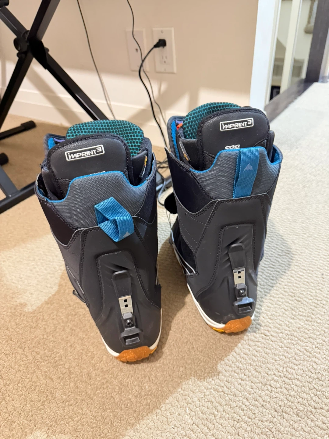 These are Burton Imprint 3 snowboard boots in black and blue. They're a size 9W and feature the Boa lacing system for a secure fit. Perfect for hitting the slopes this season! Used once