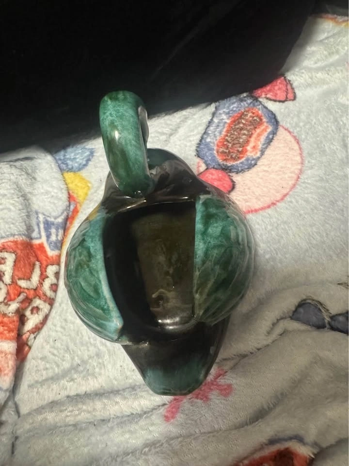 Add a touch of Canadian craftsmanship to your home with this vintage Mountain Pottery swan planter, showcasing a beautiful blue and green glaze. This charming piece is perfect for displaying small plants or as a decorative accent. It has the original Discovery Lane Agincourt Mall sticker on the bottom. This is a used item. Let this little swan bring a splash of colour to your space, eh?