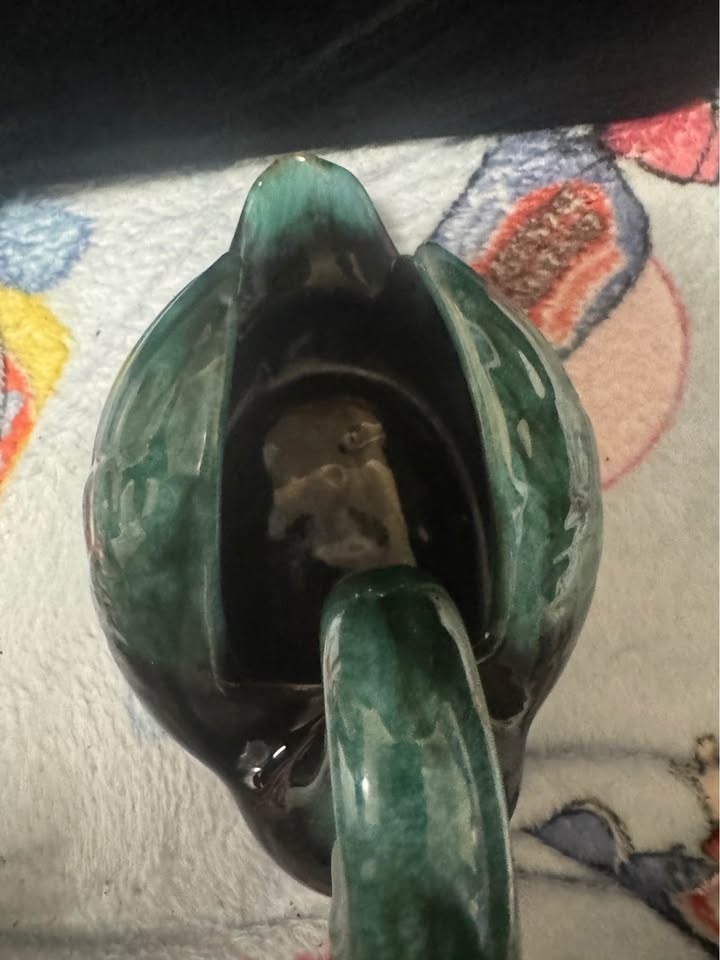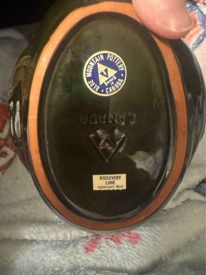 Add a touch of Canadian craftsmanship to your home with this vintage Mountain Pottery swan planter, showcasing a beautiful blue and green glaze. This charming piece is perfect for displaying small plants or as a decorative accent. It has the original Discovery Lane Agincourt Mall sticker on the bottom. This is a used item. Let this little swan bring a splash of colour to your space, eh?