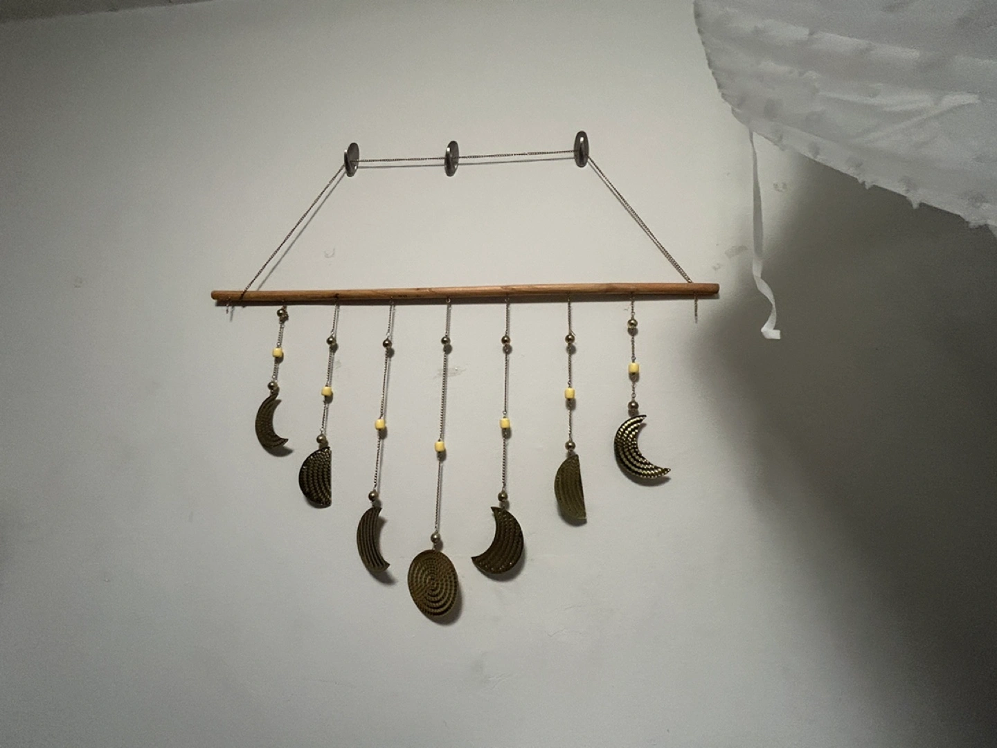 Wooden dowel with hanging chain and gold coloured moon phases. Includes beads and has a hanging system.