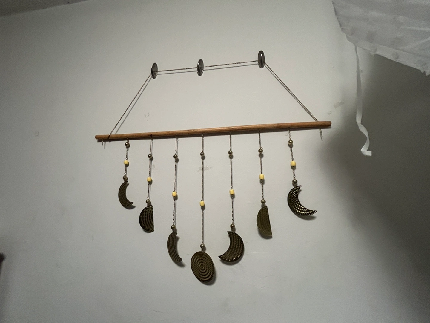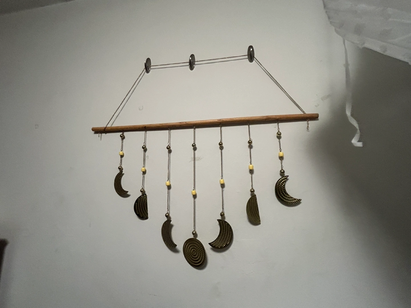 Wooden dowel with hanging chain and gold coloured moon phases. Includes beads and has a hanging system.