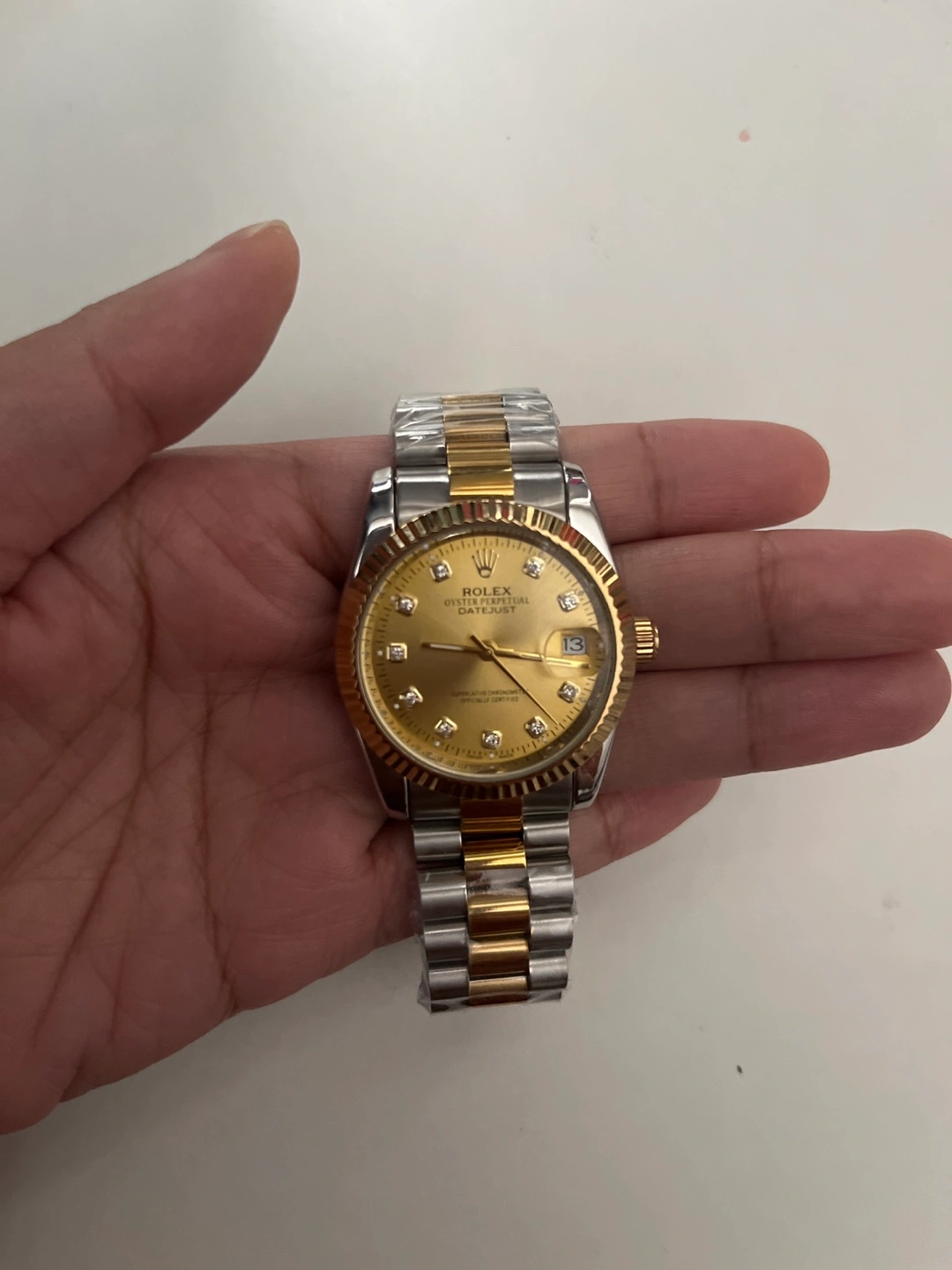 Two-tone gold and silver Rolex Datejust wristwatch. Features a gold face with diamonds. Jubilee bracelet.
