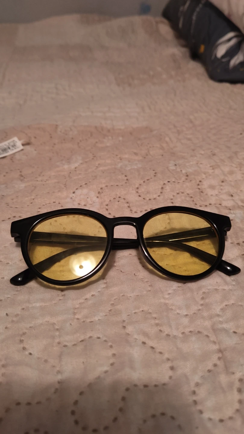 These glasses have black frames and yellow tinted lenses. They are suitable for blocking blue light or for costume use.