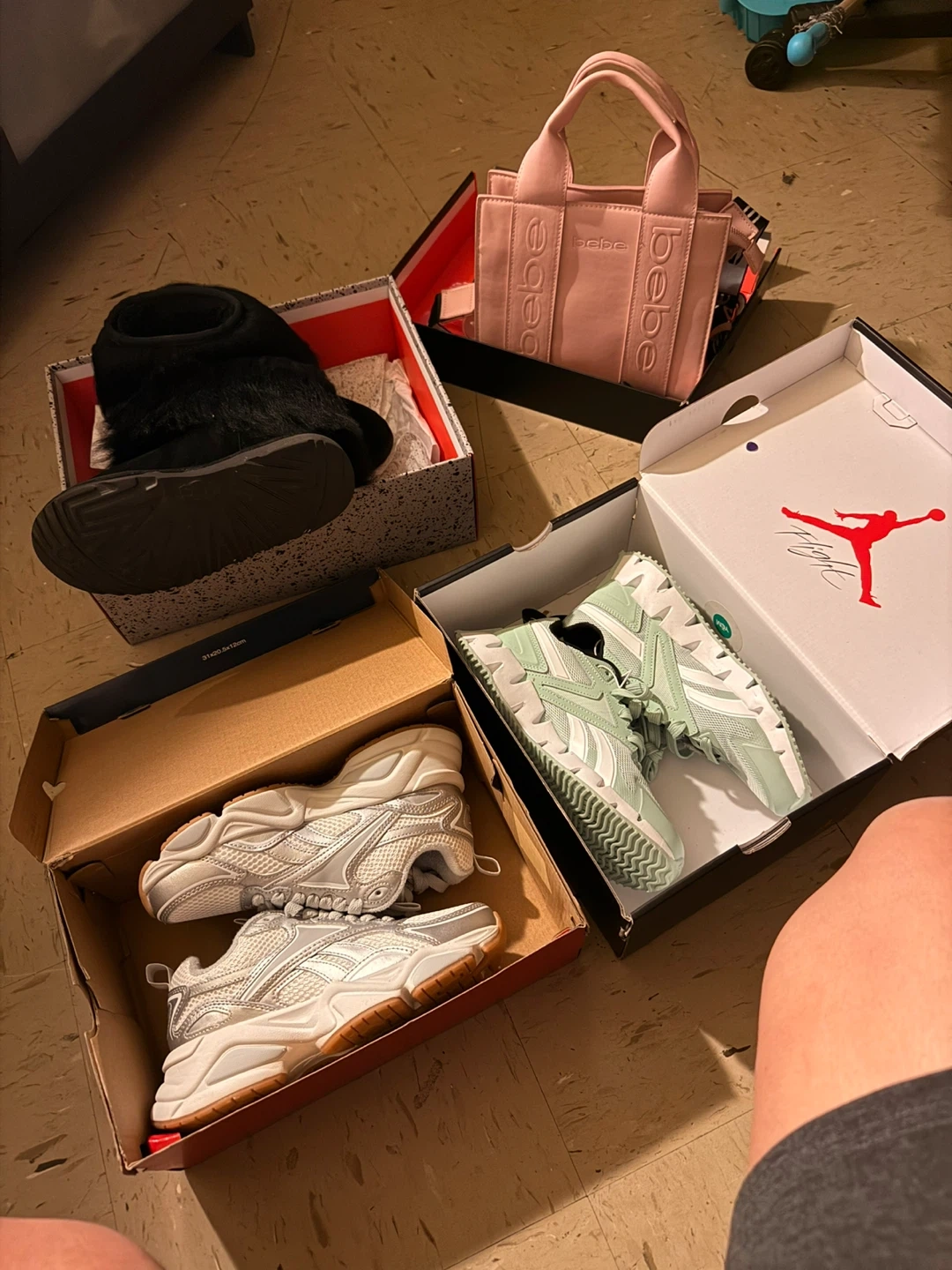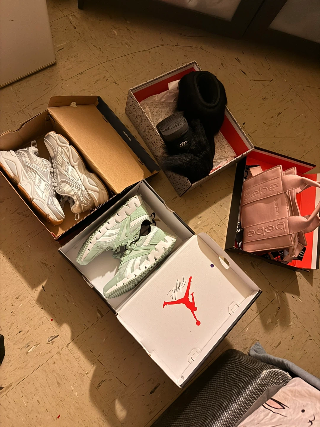 This is a Bebe Hana mini PU satchel crossbody bag in Rose. It has a MSRP of $80.00. It's a stylish accessory for everyday use! Plus two Reebok sneakers 6 1/2 and a pair of Uggs 3 1/2