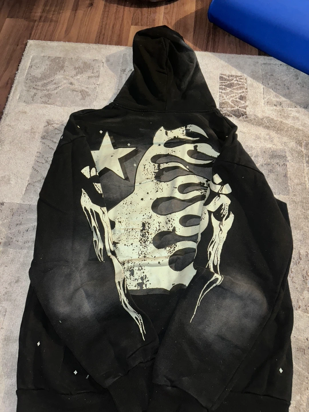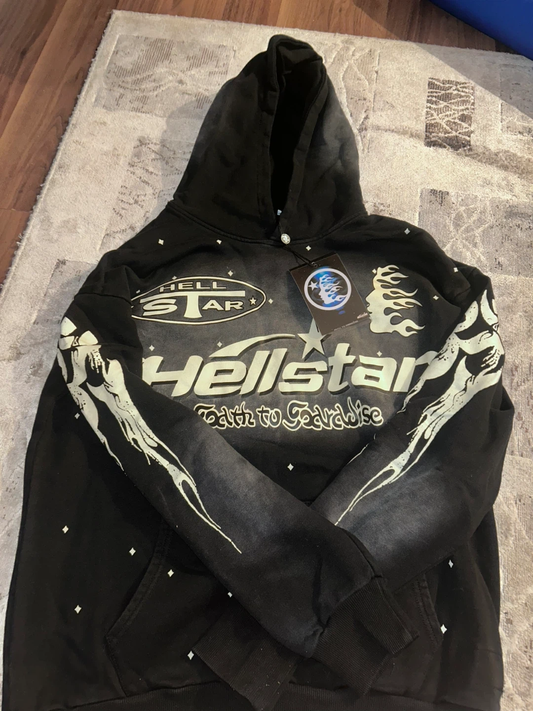 Black Hellstar hoodie with graphic print on front and back. Includes matching graphic print flare pants. Both items are new in packaging.