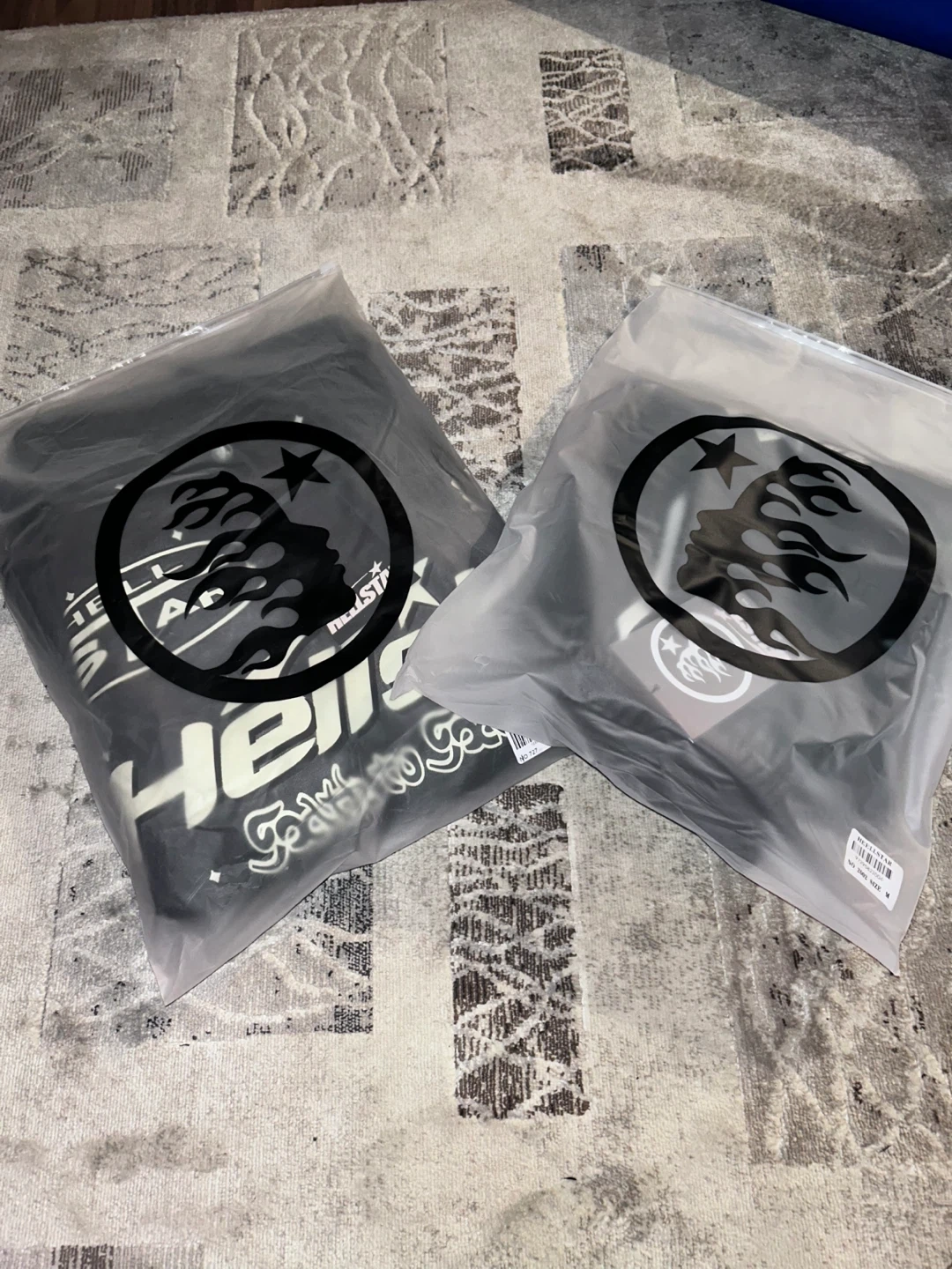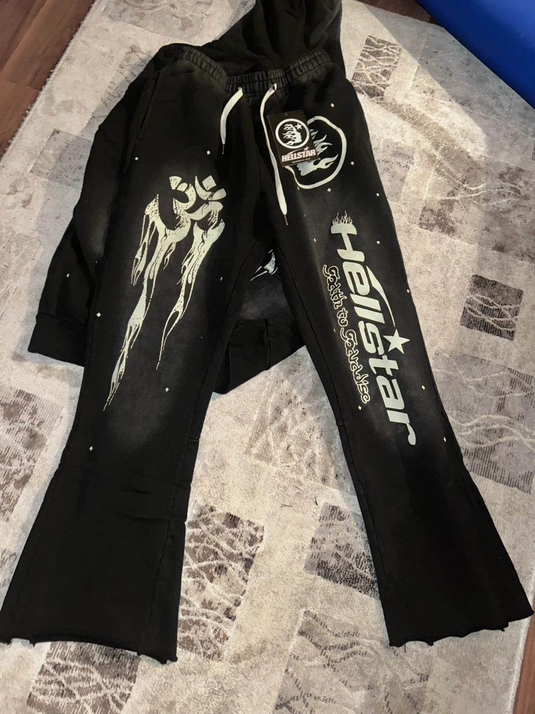 Black Hellstar hoodie with graphic print on front and back. Includes matching graphic print flare pants. Both items are new in packaging.