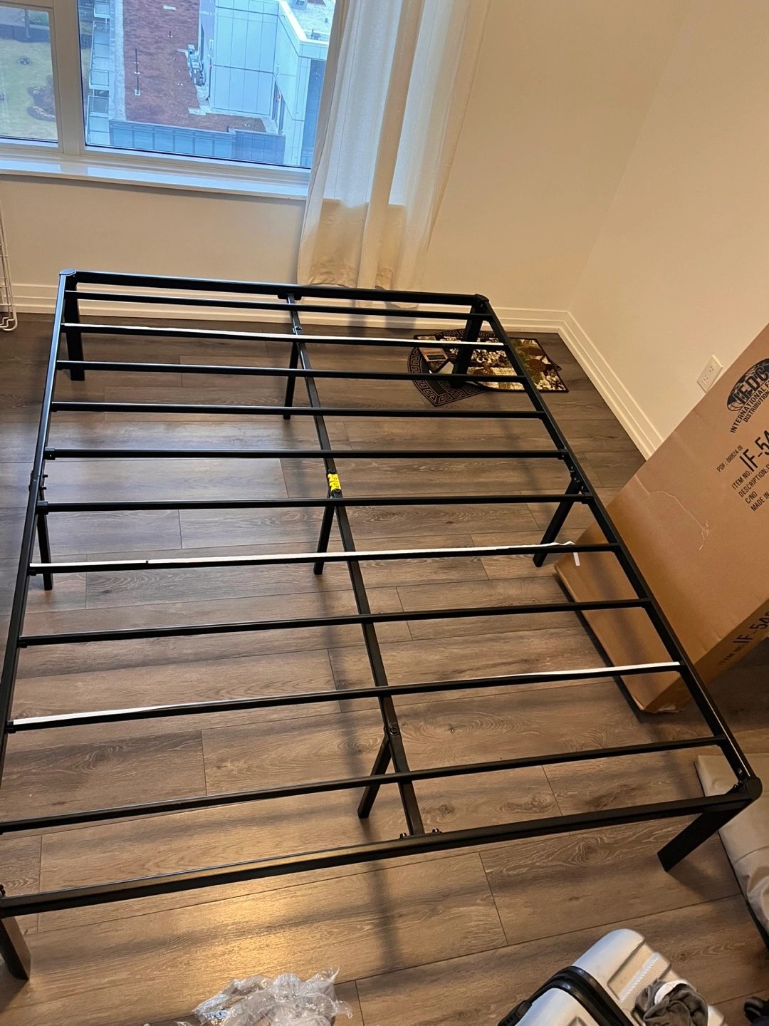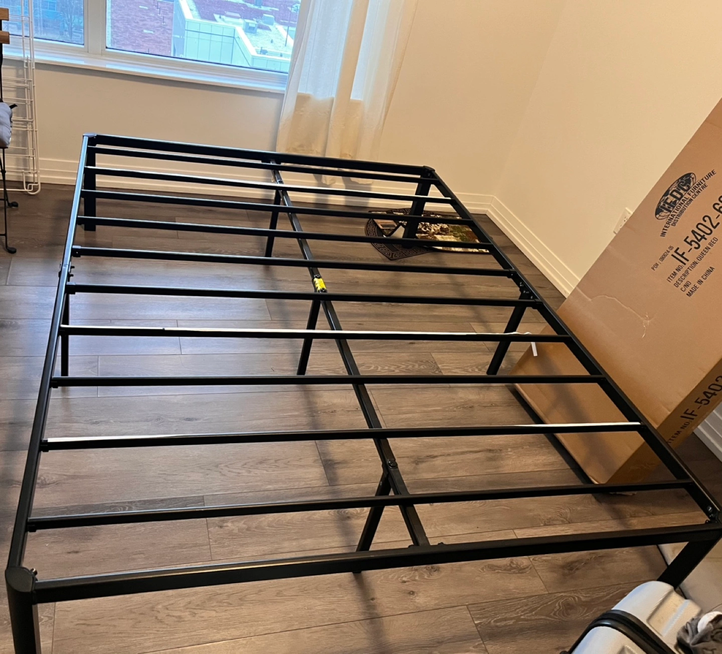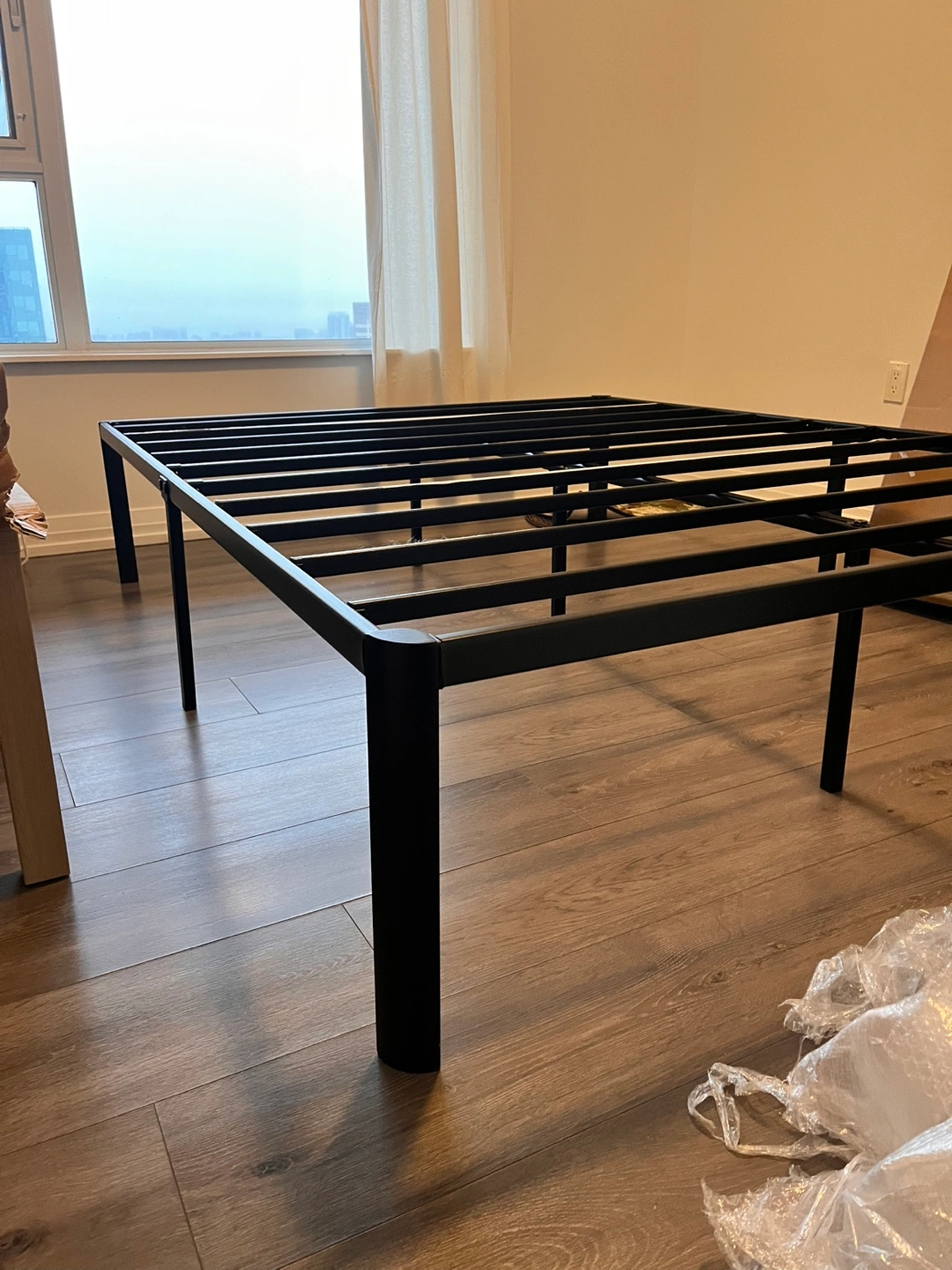 Queen-size platform bed frame. Metal construction. Easy assembly. No box spring needed. Underbed storage. Black colour. Like new. (only used for 15 days)