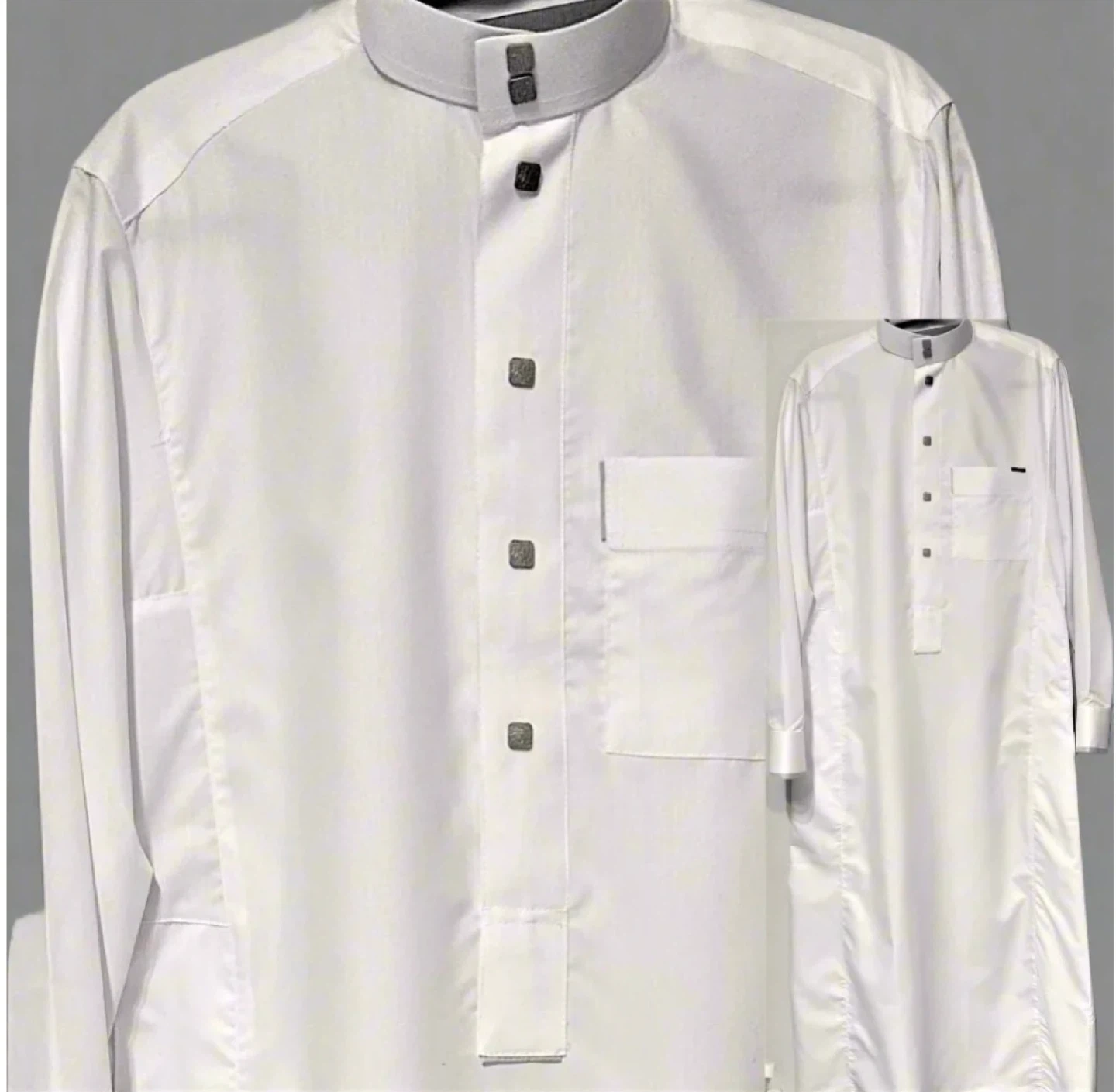 This is a white thobe with a mandarin collar and silver square buttons. It has a chest pocket and two side pockets. Made from a lightweight fabric, it's perfect for everyday wear or special occasions. It's a versatile piece that offers comfort and style.