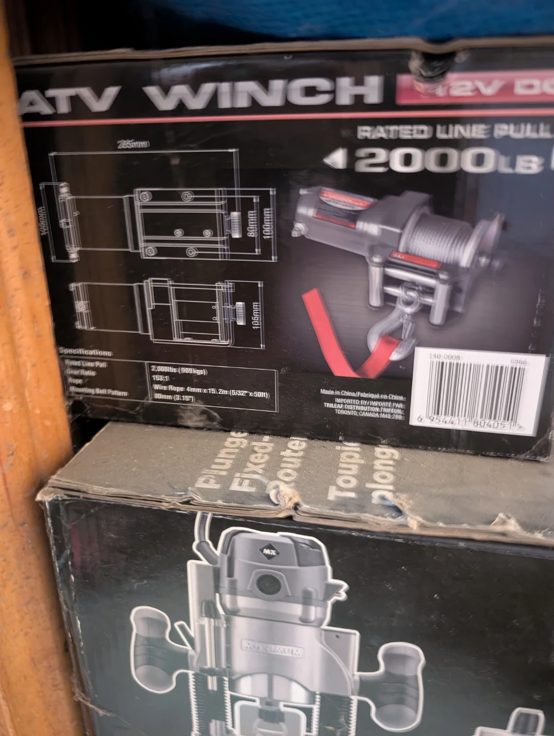 Selling an ATV Winch with a 12V DC motor and a rated line pull of 2000 lbs (909 kgs)! The gear ratio is 153:1 and the wire rope measures 4mm x 15.2m (5/32" x 50ft). The mounting bolt pattern is 80mm (3.15").