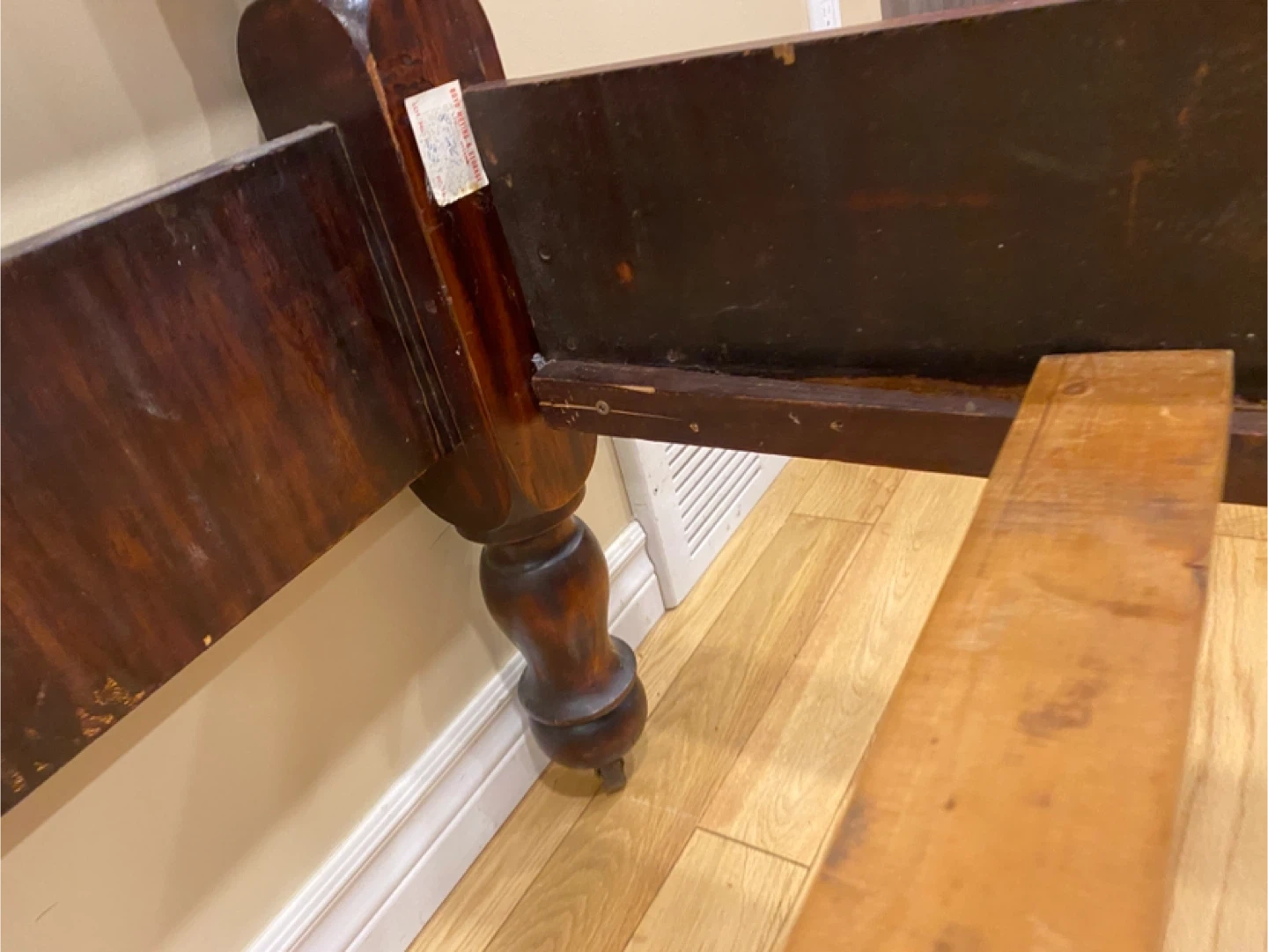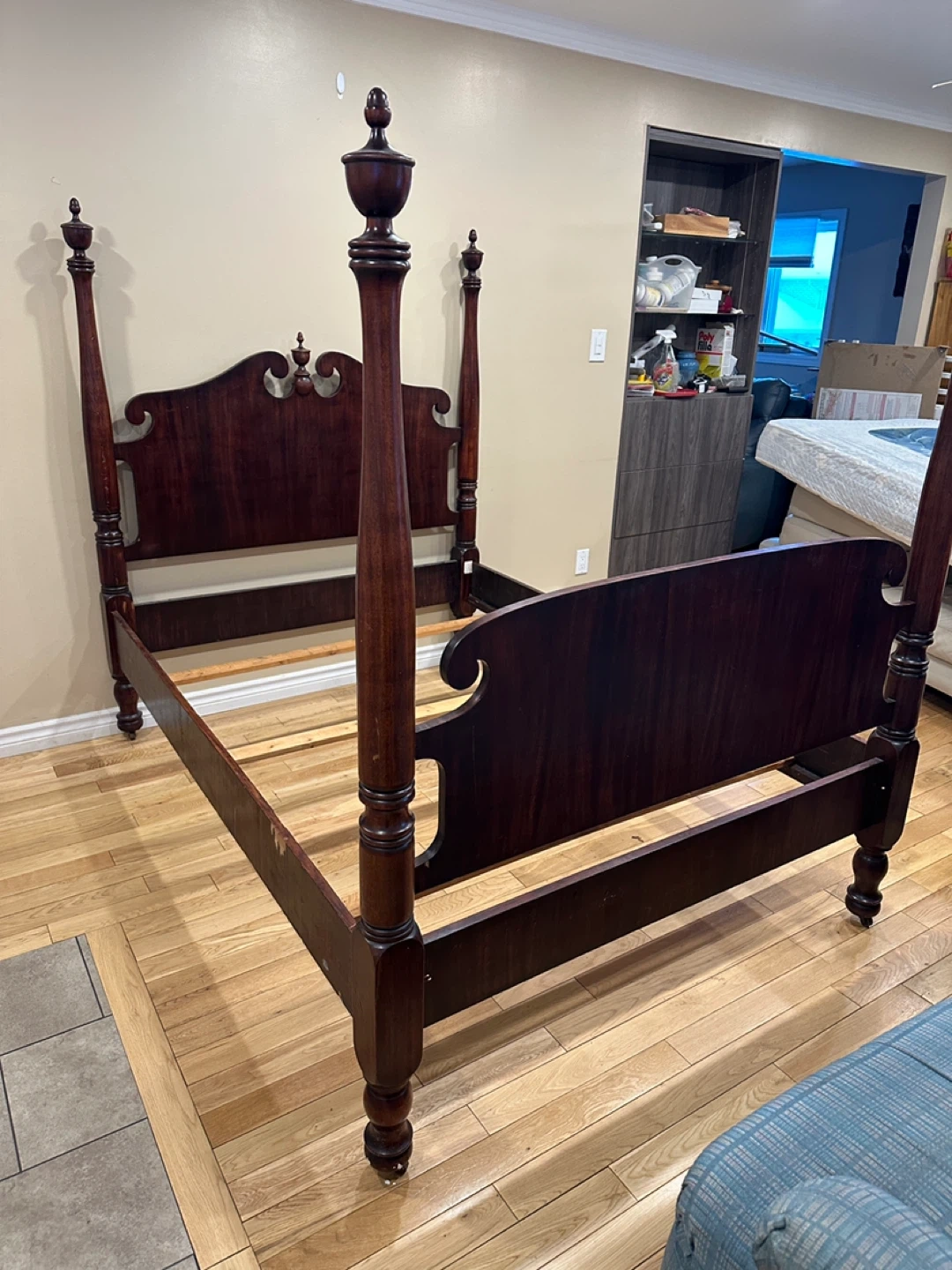Solid wood vintage poster bed with classic turned posts and scroll headboard/footboard. Strong and sturdy.