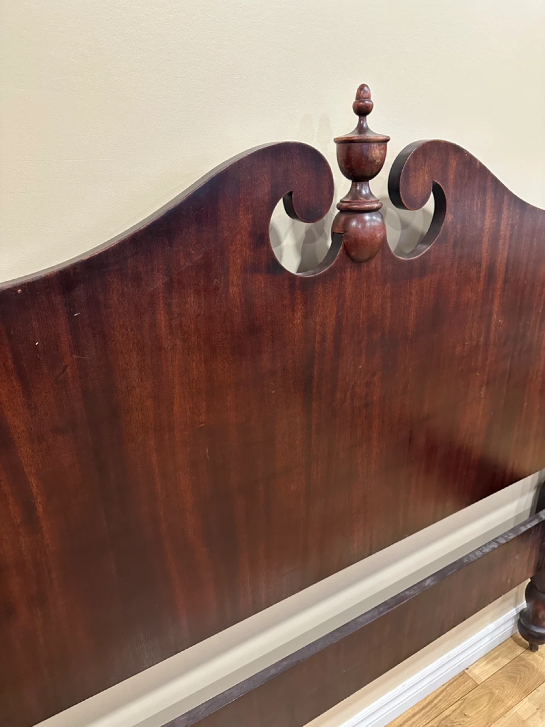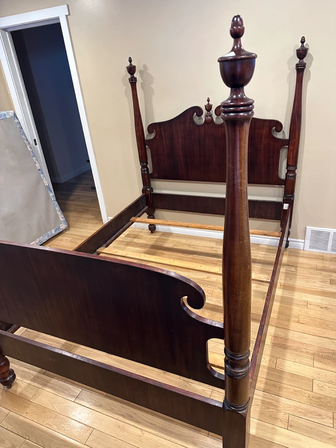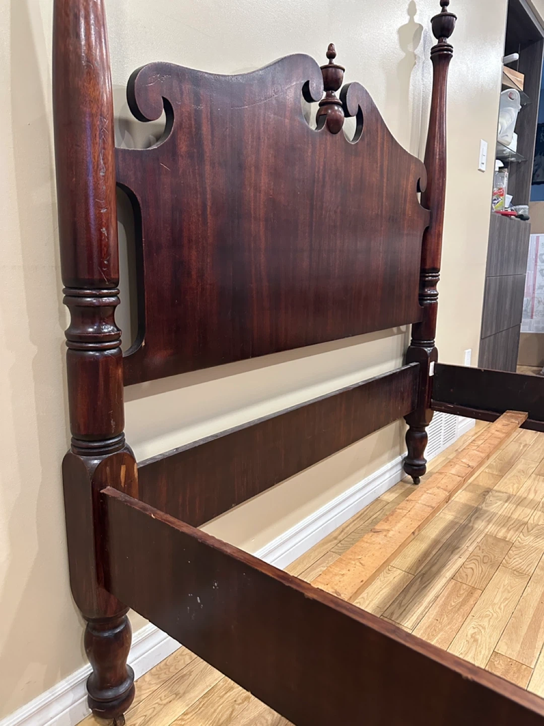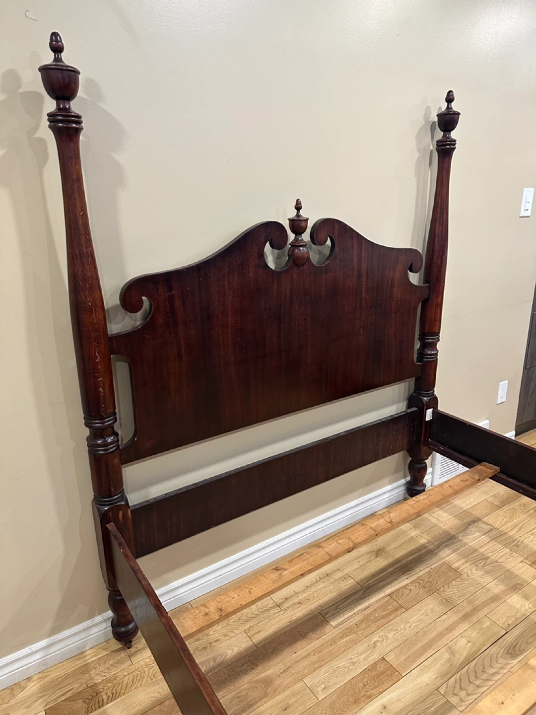 Solid wood vintage poster bed with classic turned posts and scroll headboard/footboard. Strong and sturdy.