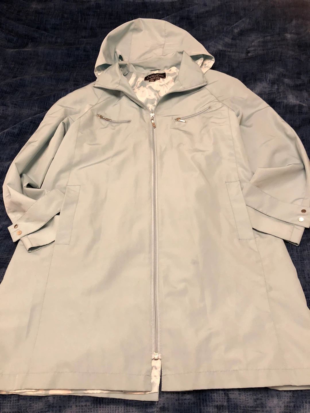 This is an Apropos Adorable Junior rain jacket in size M. The outer shell is 100% polyester with a 100% polyurethane coating. The lining is also 100% polyester. It's in great condition and ready for those rainy days!