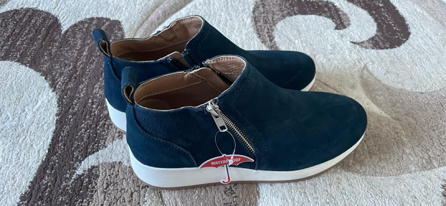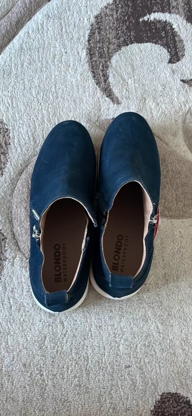 Navy blue suede ankle boots from Blondo. They're waterproof and feature a side zipper for easy on and off. The sole is a durable rubber. Not used new got the wrong size and couldn't return it.