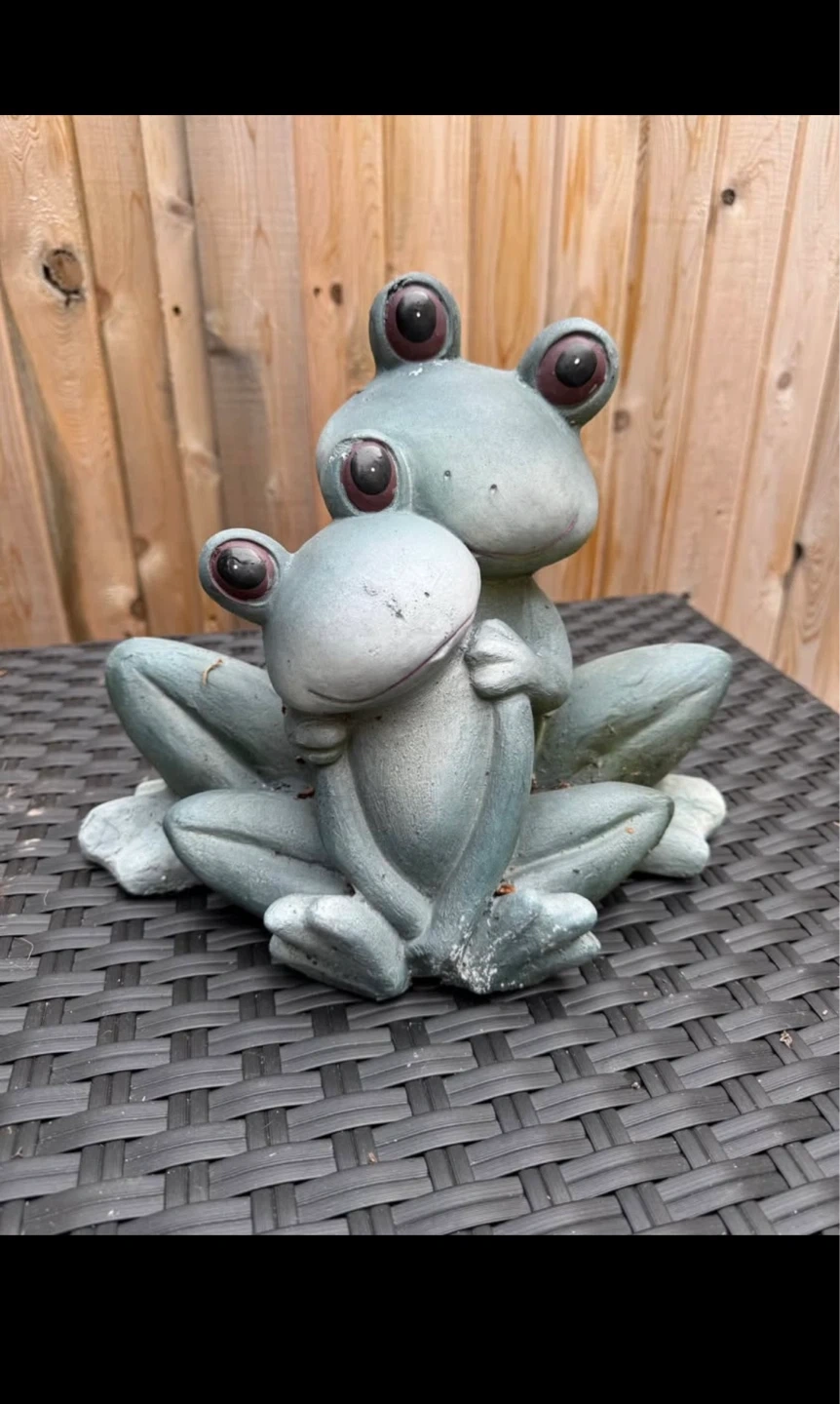 This adorable garden statue features two frogs hugging. It's made from a durable material for outdoor use. It adds a touch of whimsy to any garden or patio space!