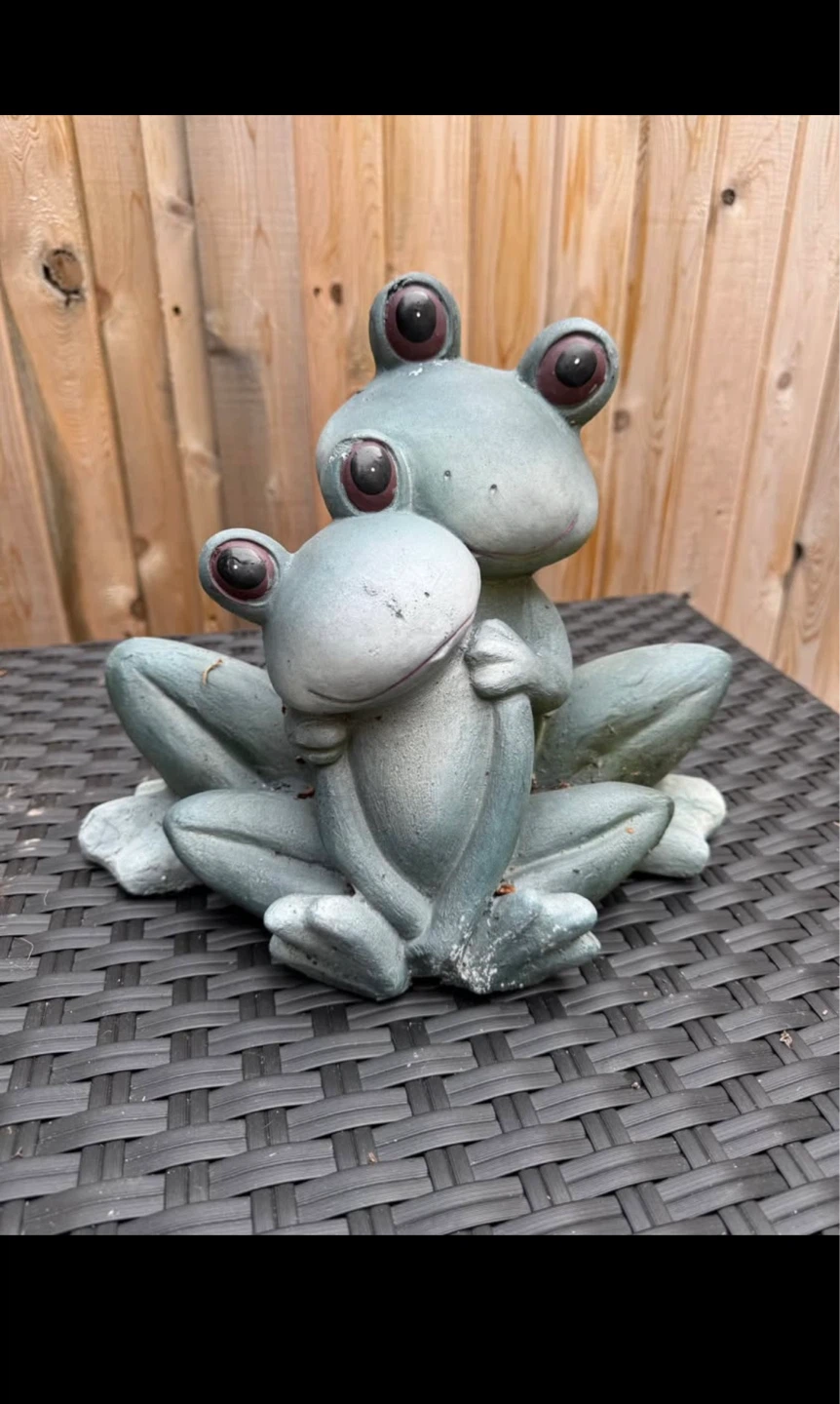 This adorable garden statue features two frogs hugging. It's made from a durable material for outdoor use. It adds a touch of whimsy to any garden or patio space!