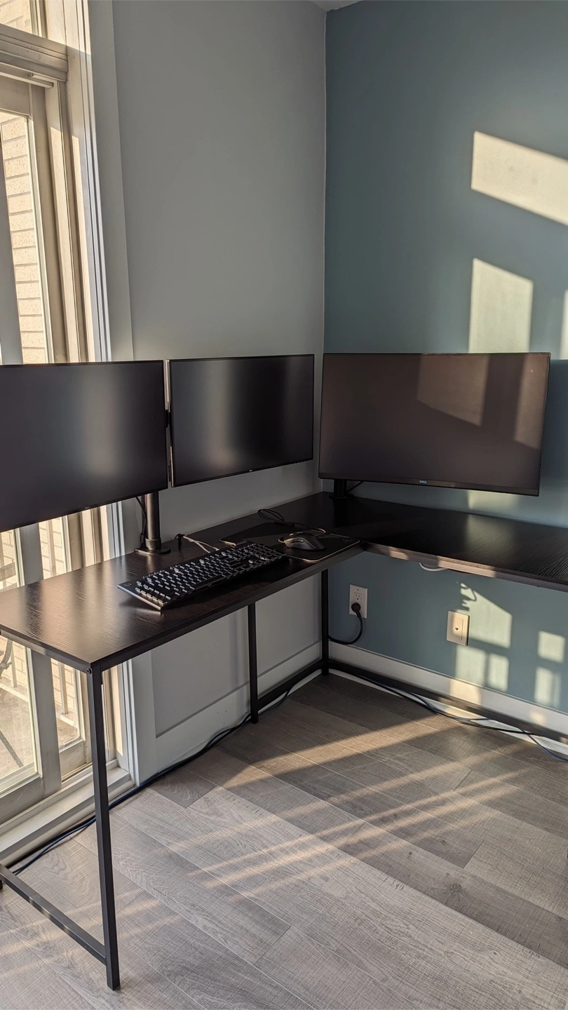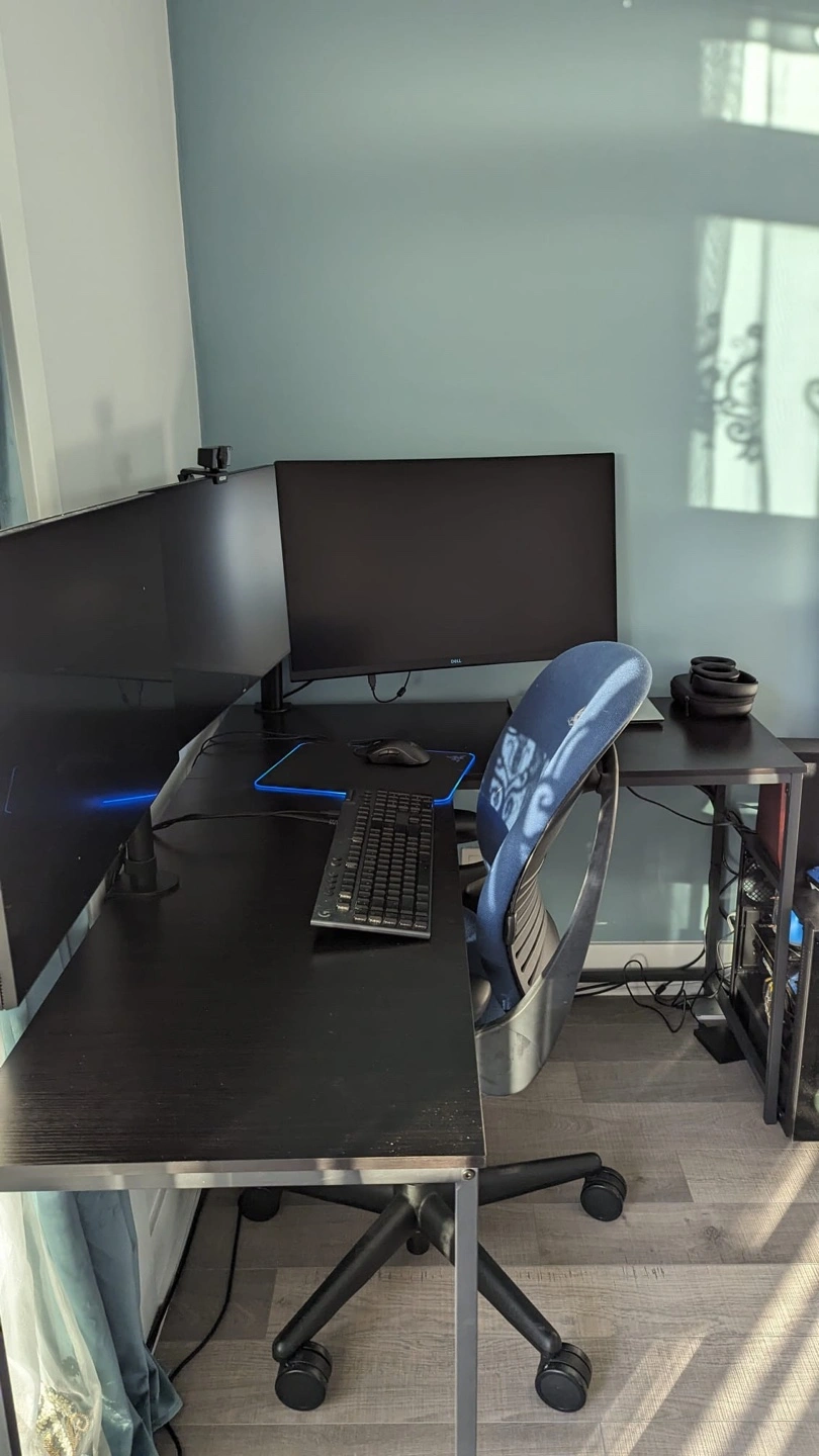 Selling a complete office desk setup in black. Perfect for a home office or gaming setup. Includes a spacious desk surface and additional shelving. Ready to go to a new home!