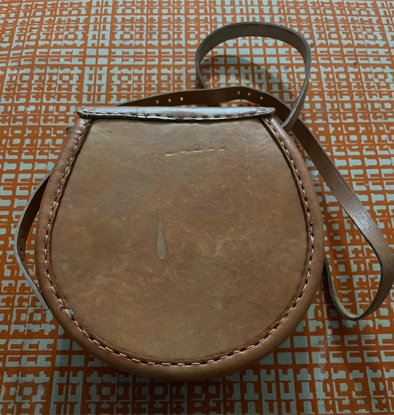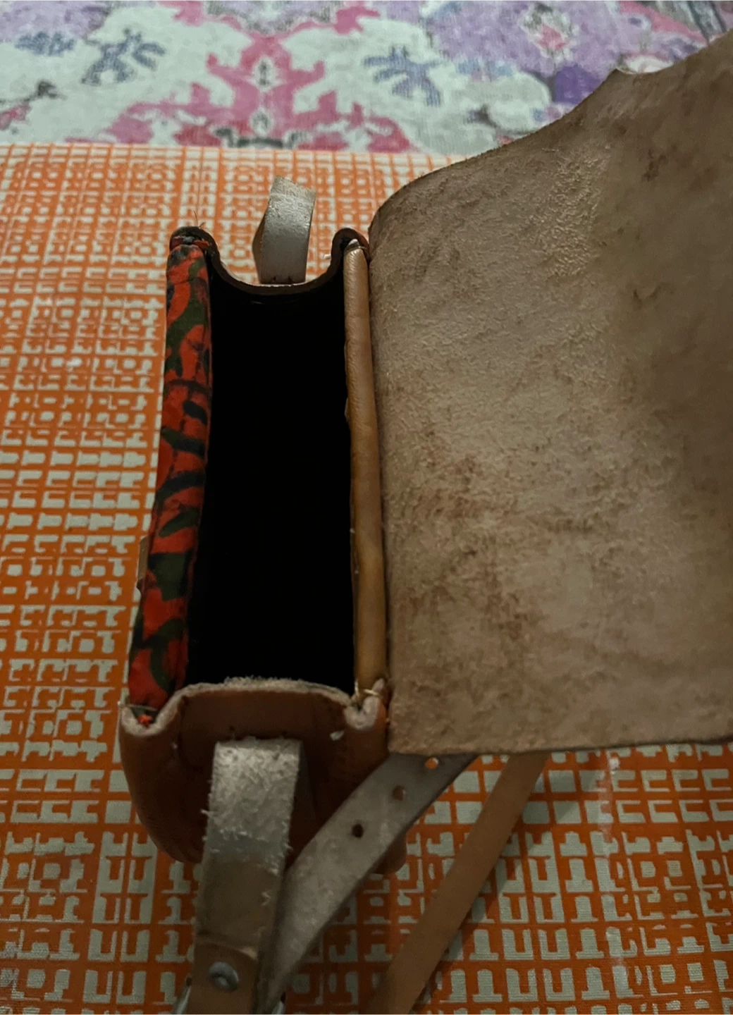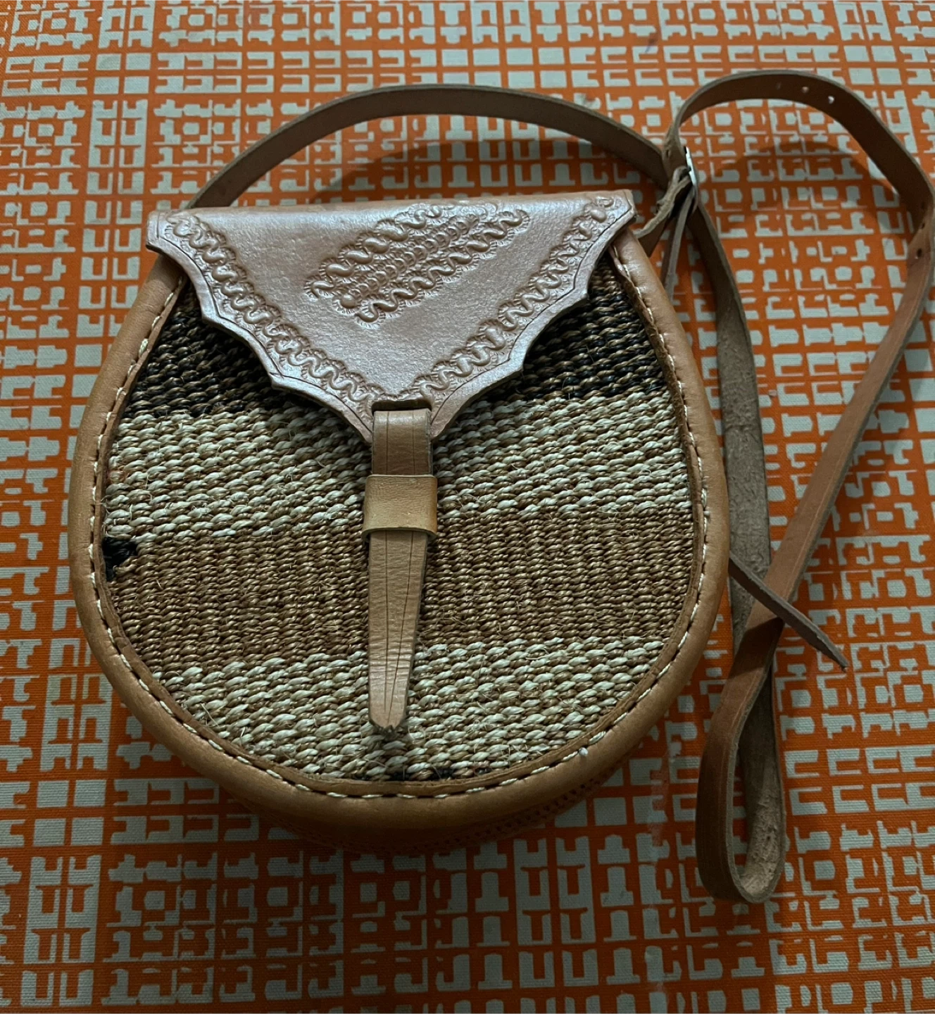 Small cross-body bag with a woven front and leather details. It has a leather strap and a decorative flap closure. Interior lining is patterned fabric.