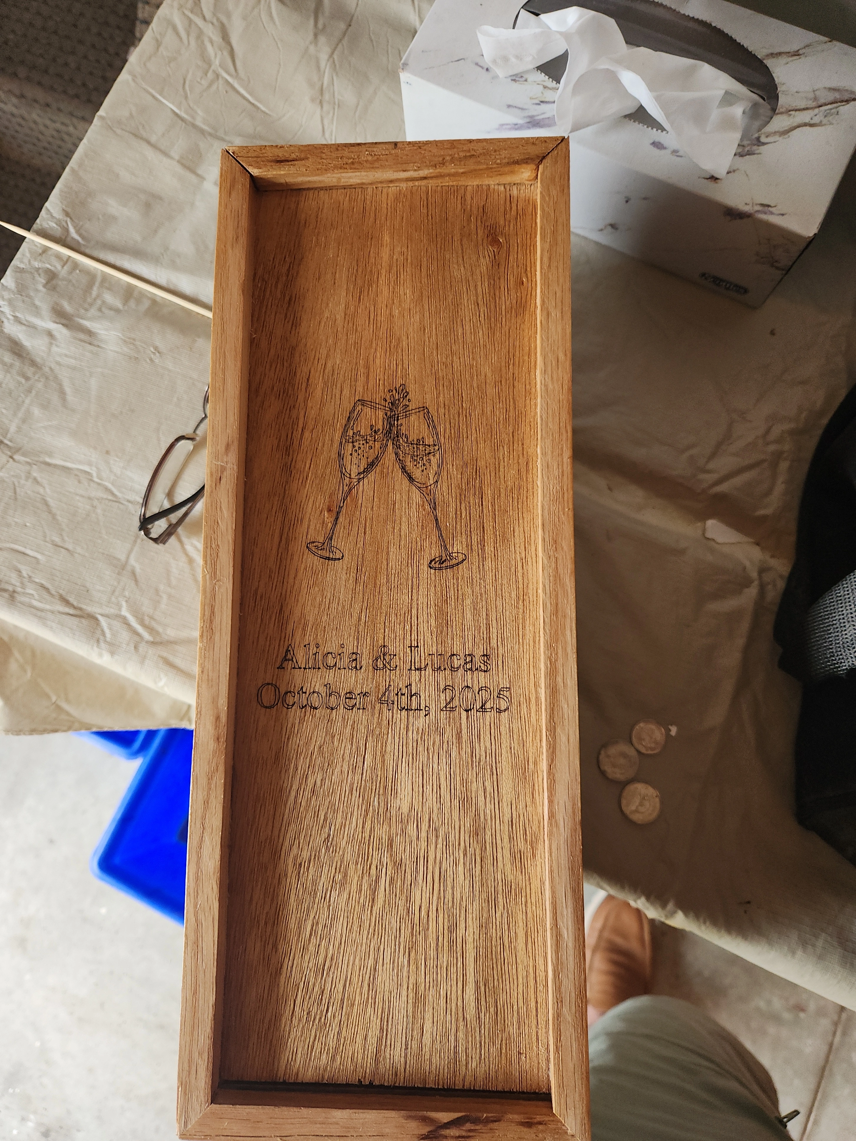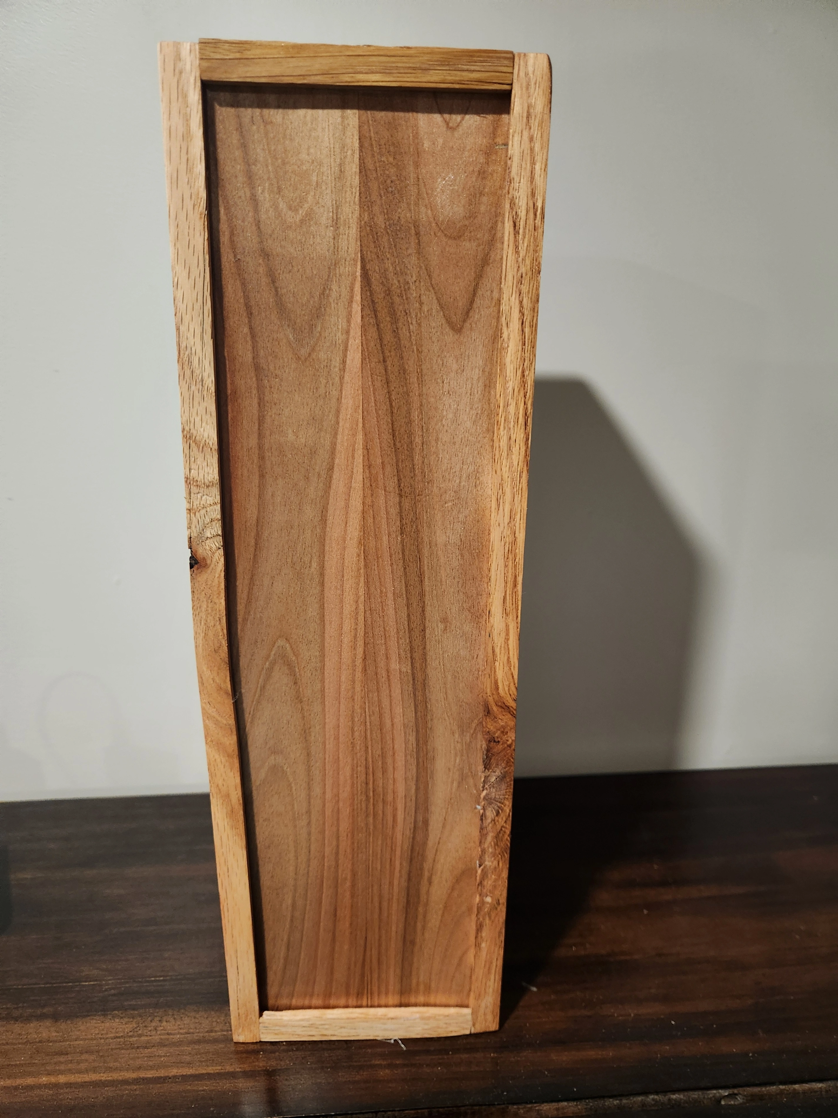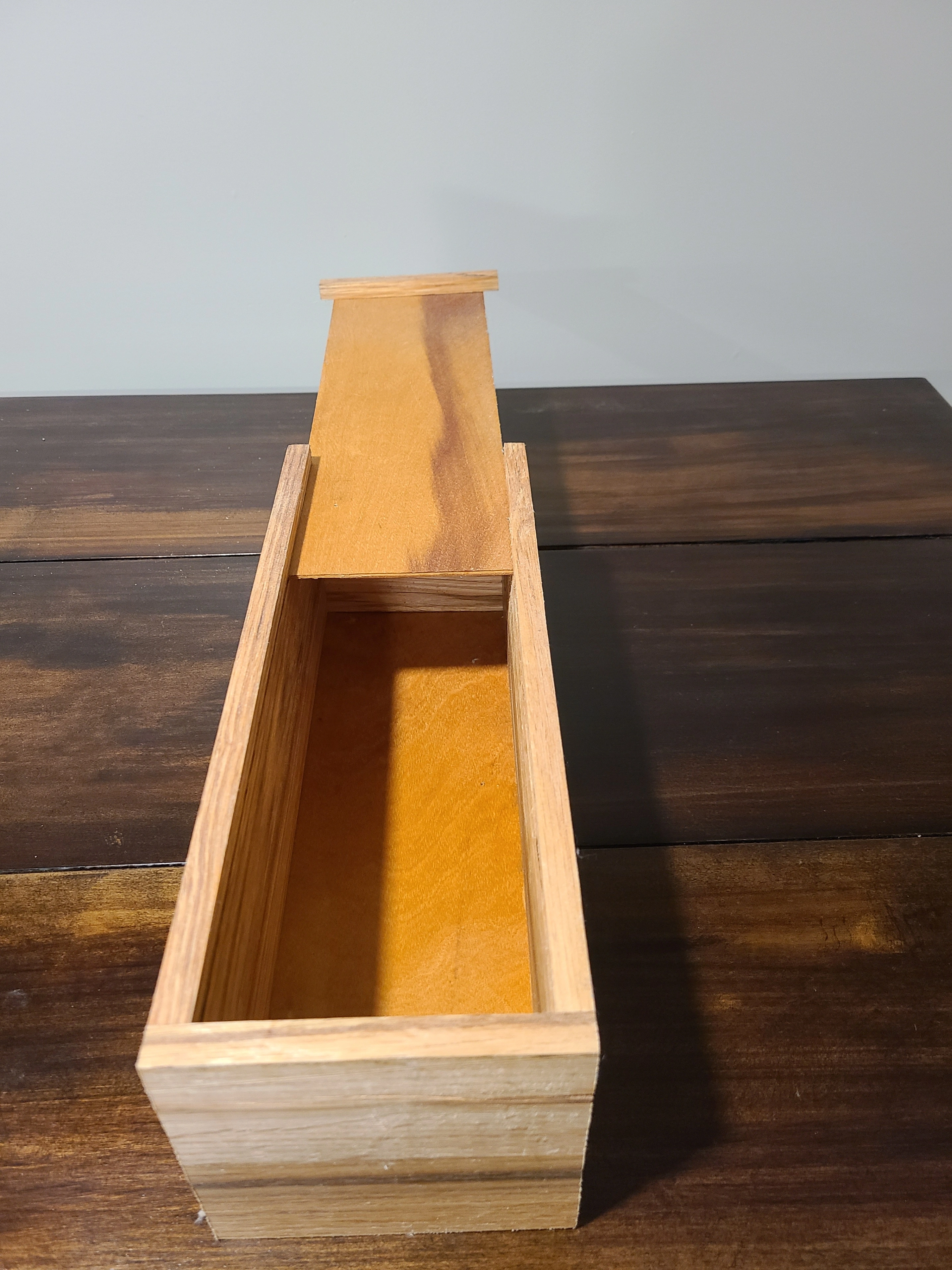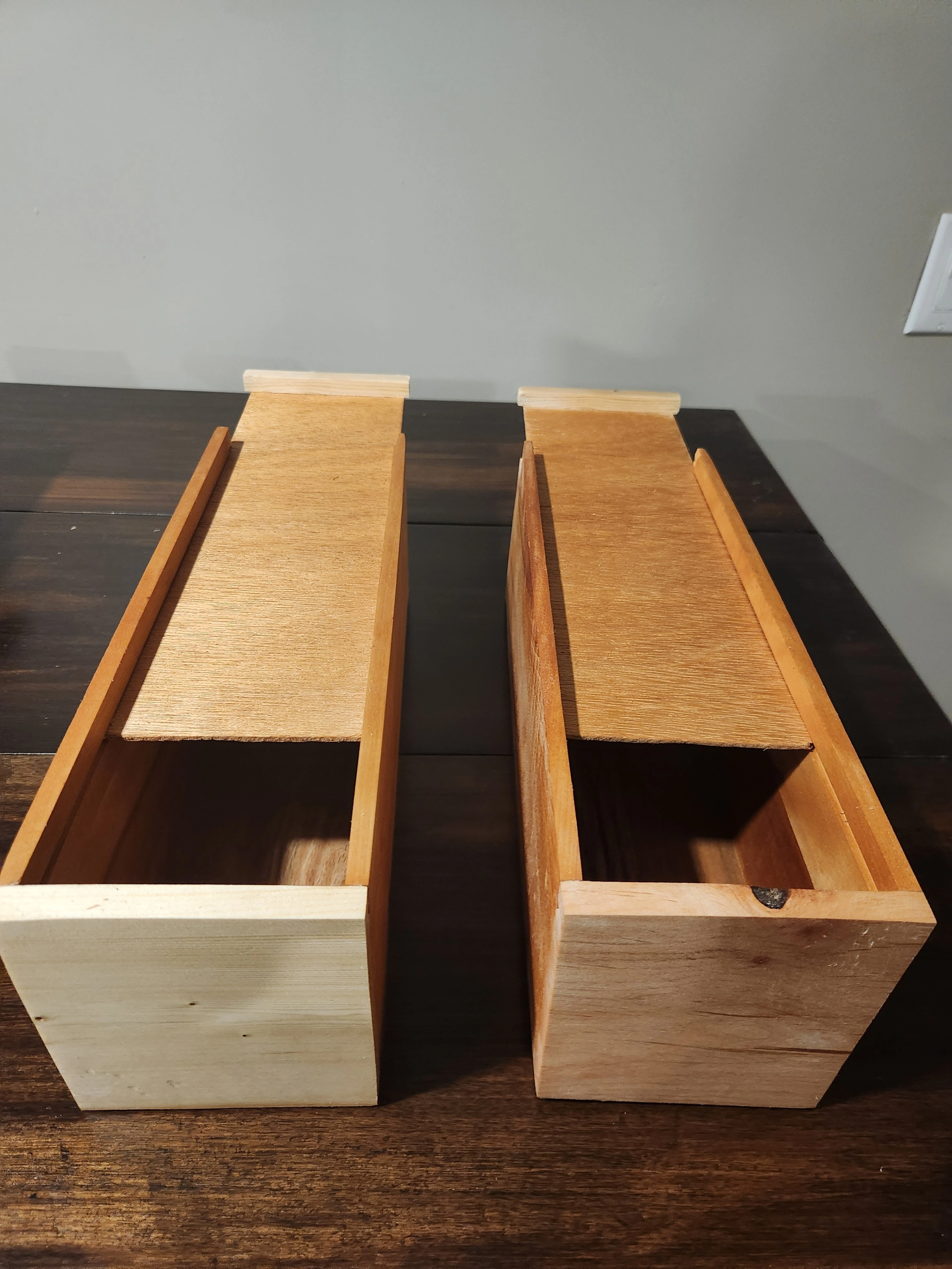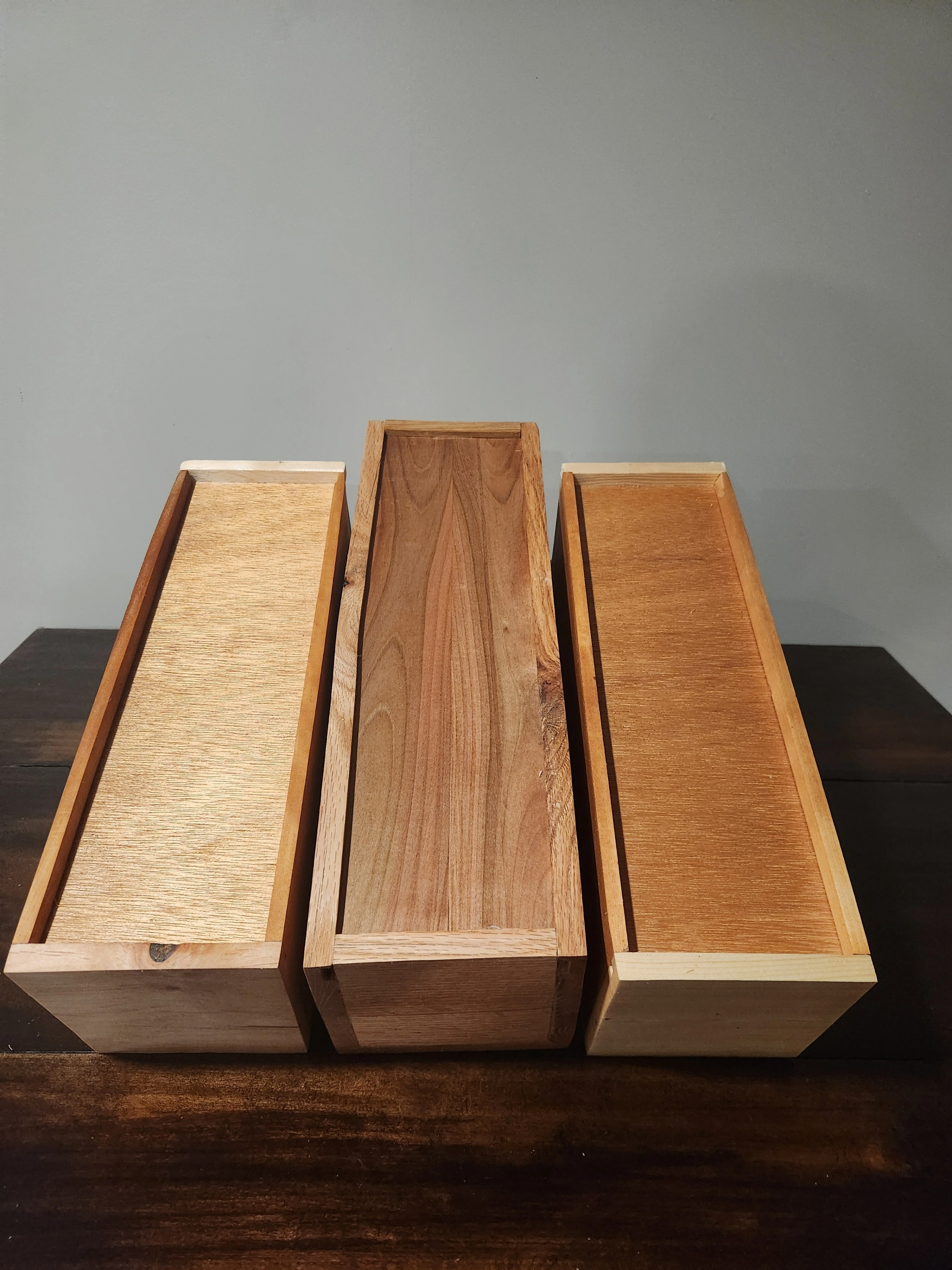 These are wood boxes (oak, maple pine)with sliding tops. Small boxes are about 13 inches, inside length or large about 15 inches inside length. Boxes have a natural finish. Boxes can also be personalized (additional cost depending on what is printed, example pic shows $5 personalization) Small $15, Large $20