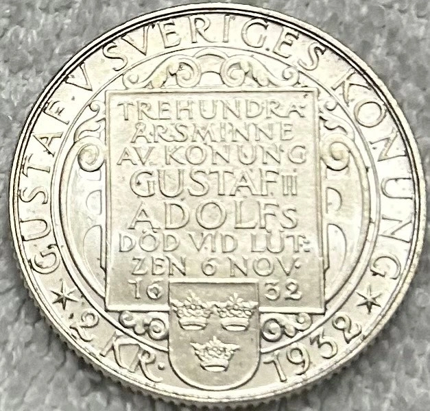 This is a commemorative 2 Kronor coin from Sweden, marking the 300th anniversary of the death of King Gustaf II Adolf. The coin features a portrait of Gustaf V on one side and an inscription commemorating Gustaf II Adolf's death in 1632 on the other. The coin has little to no wear from age or handling. Remaining in spotless condition as seen in the photos above. Country: Sweden Denomination: 2 Kronor Year: 1932 Commemorates: 300th Anniversary of the Death of Gustaf II Adolf Material: Silver (.800) If the ad is up, the coin is available!