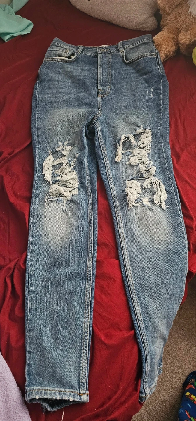 These are distressed blue denim jeans from We The Free. They're a size 29 waist. Features ripped detailing on the front and distressed hem.