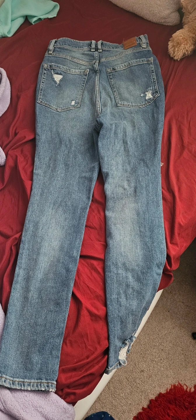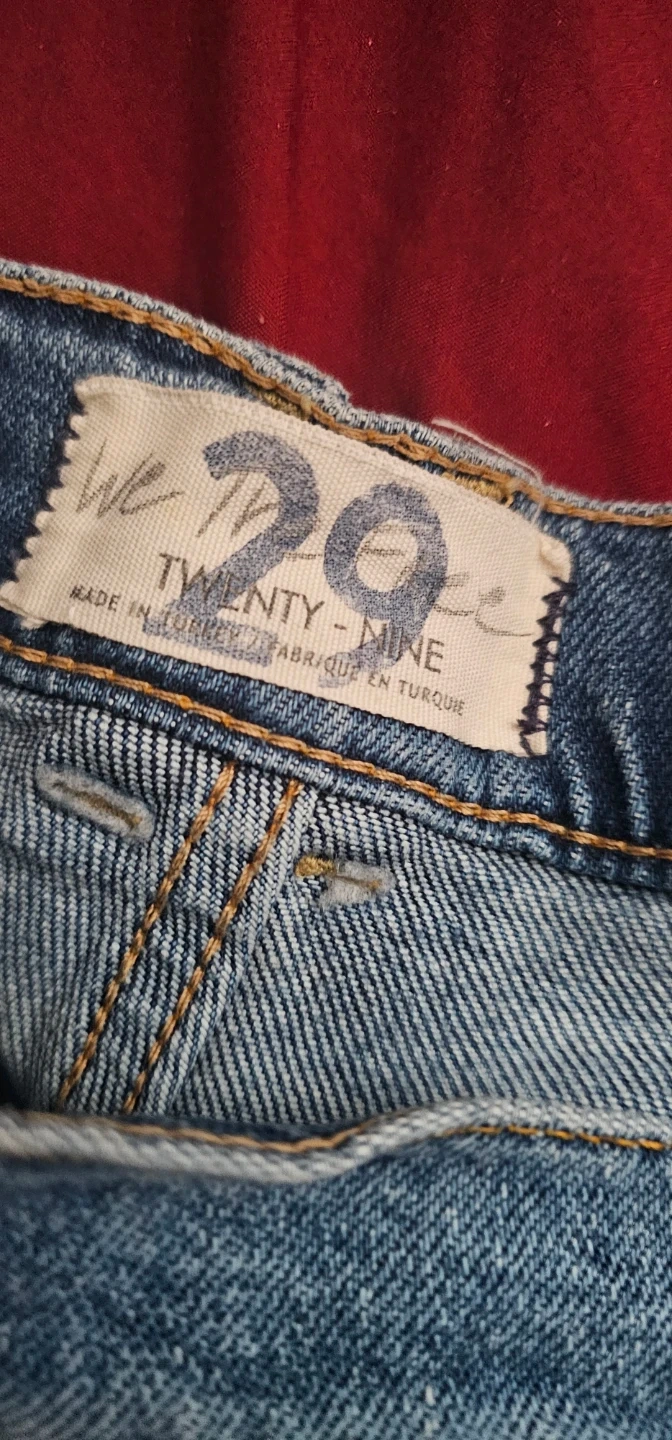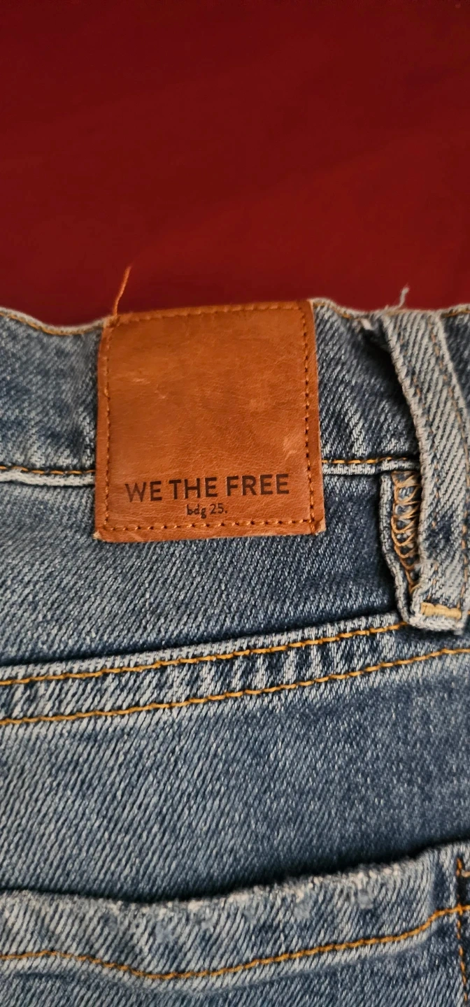 These are distressed blue denim jeans from We The Free. They're a size 29 waist. Features ripped detailing on the front and distressed hem.