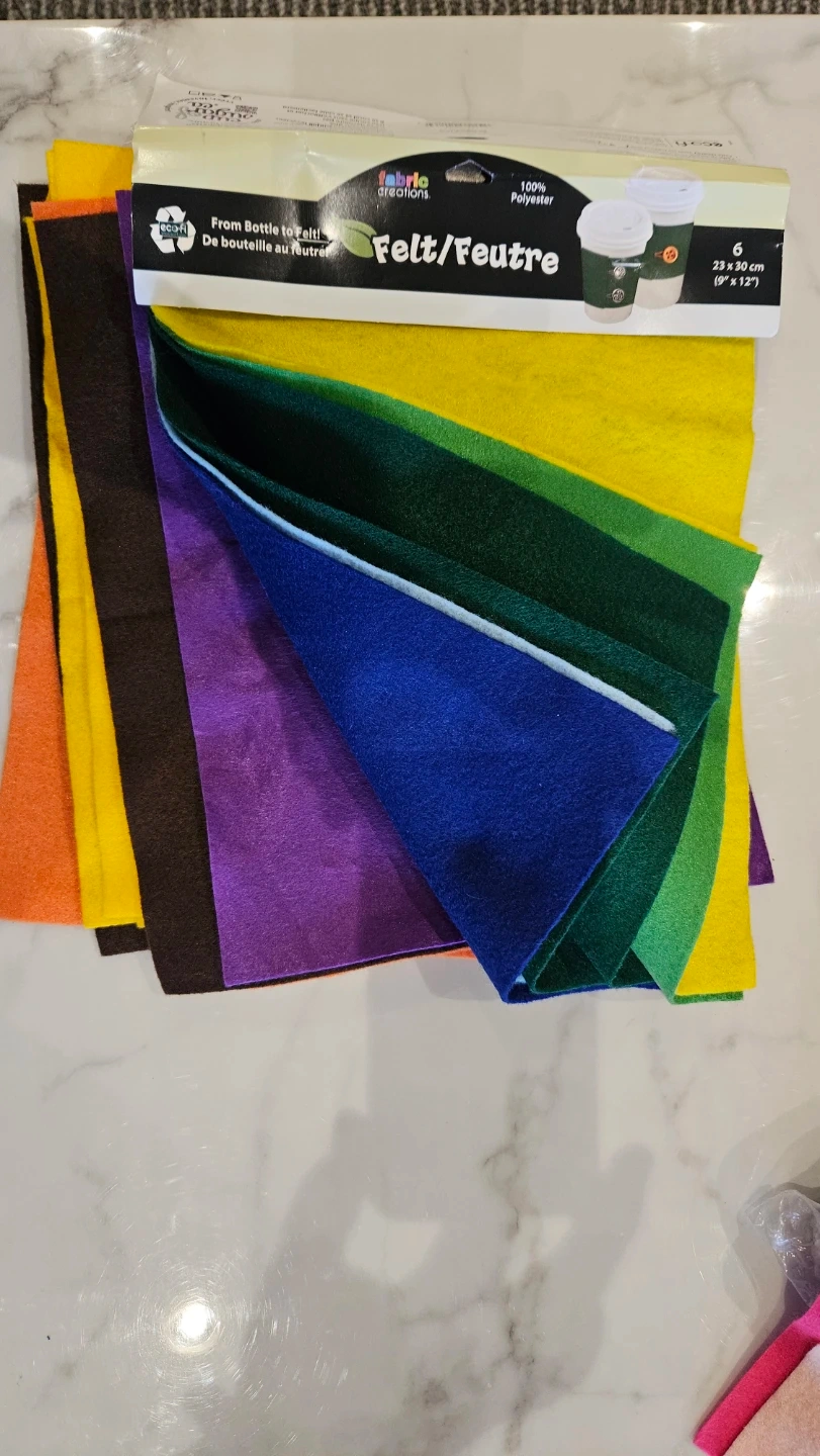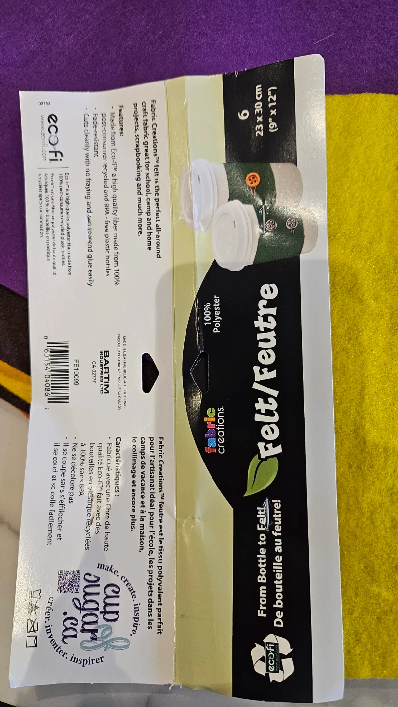 Includes six sheets of felt, each measuring 9" x 12". Made from 100% polyester derived from recycled plastic bottles. These colourful felt sheets are perfect for crafts, scrapbooking, and school projects.