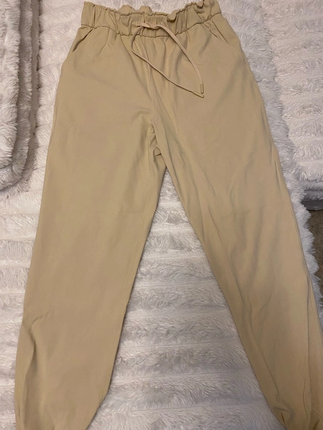 These are used Lululemon On the Fly joggers in a size small and in excellent condition. They're perfect for workouts or just lounging around. Specifics: * Brand: Lululemon * Style: On the Fly * Size: 6 * Colour: Tan While my crystal ball isn't working today, I can predict that if this ad is up, these comfy joggers are still available!