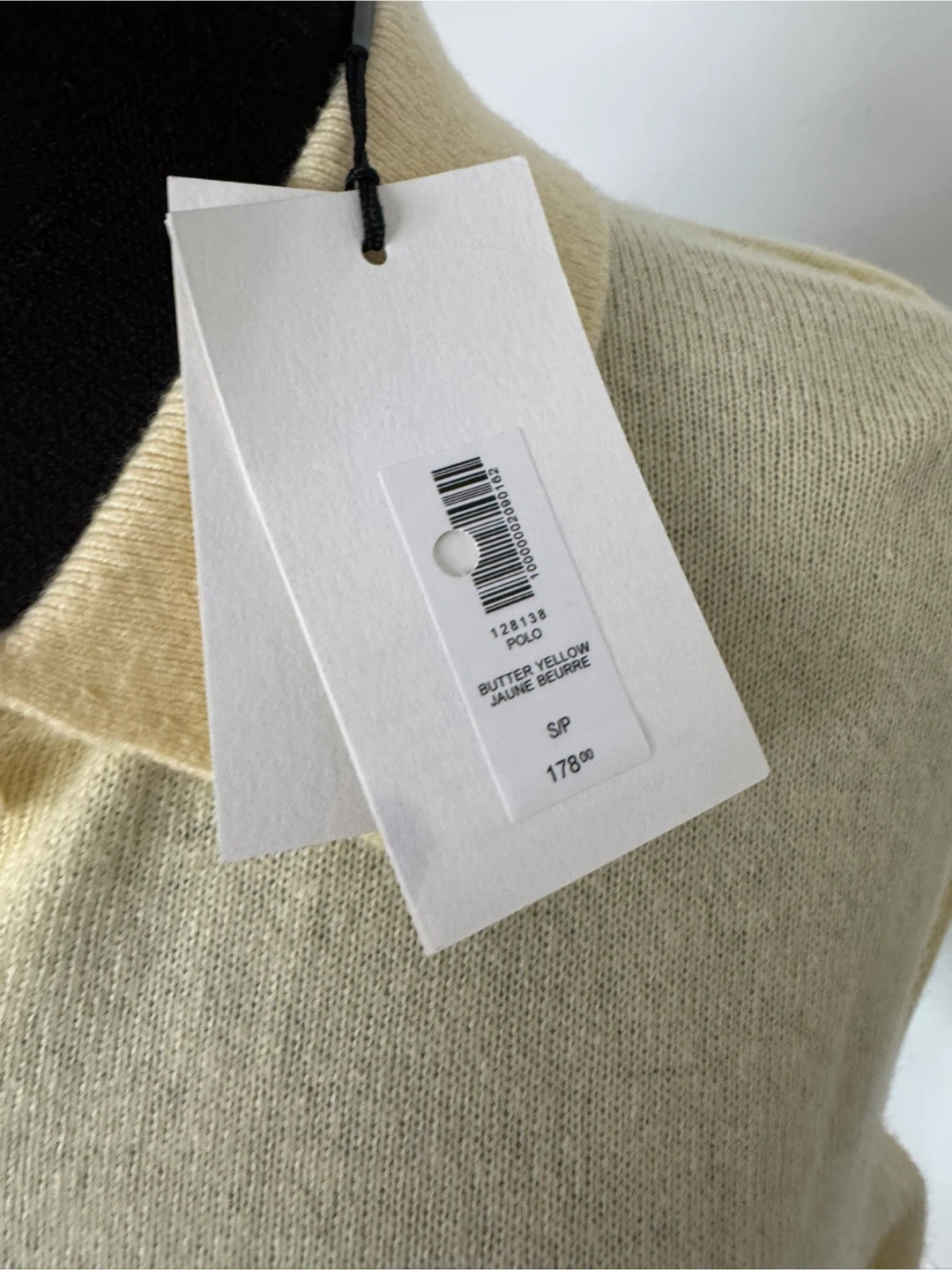 This Aritzia polo cashmere sweater comes in a lovely butter yellow shade. It's a size S/P. The material appears to be a fine knit, perfect for layering or wearing on its own. A versatile piece for any wardrobe!