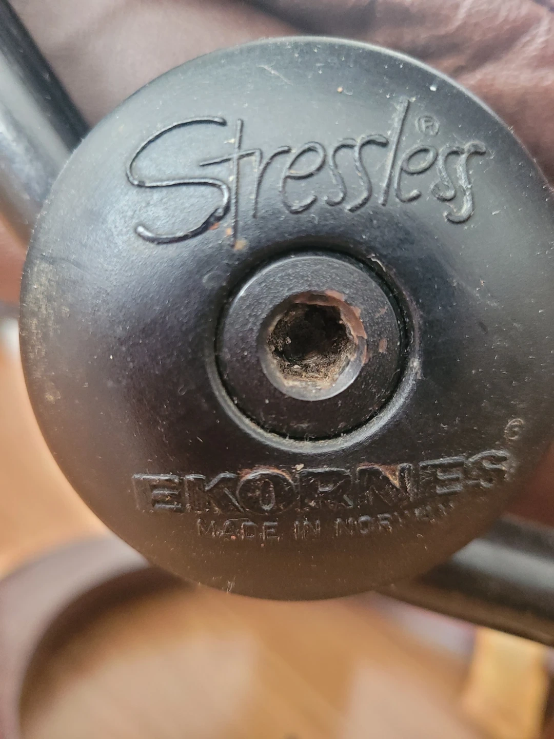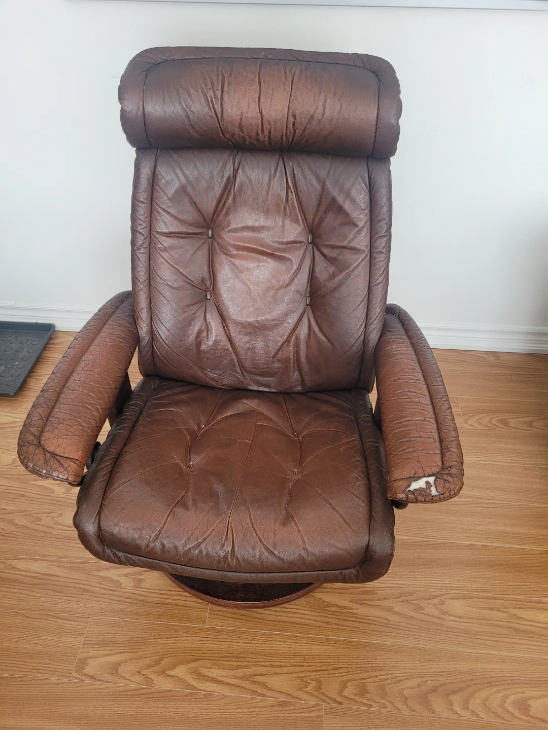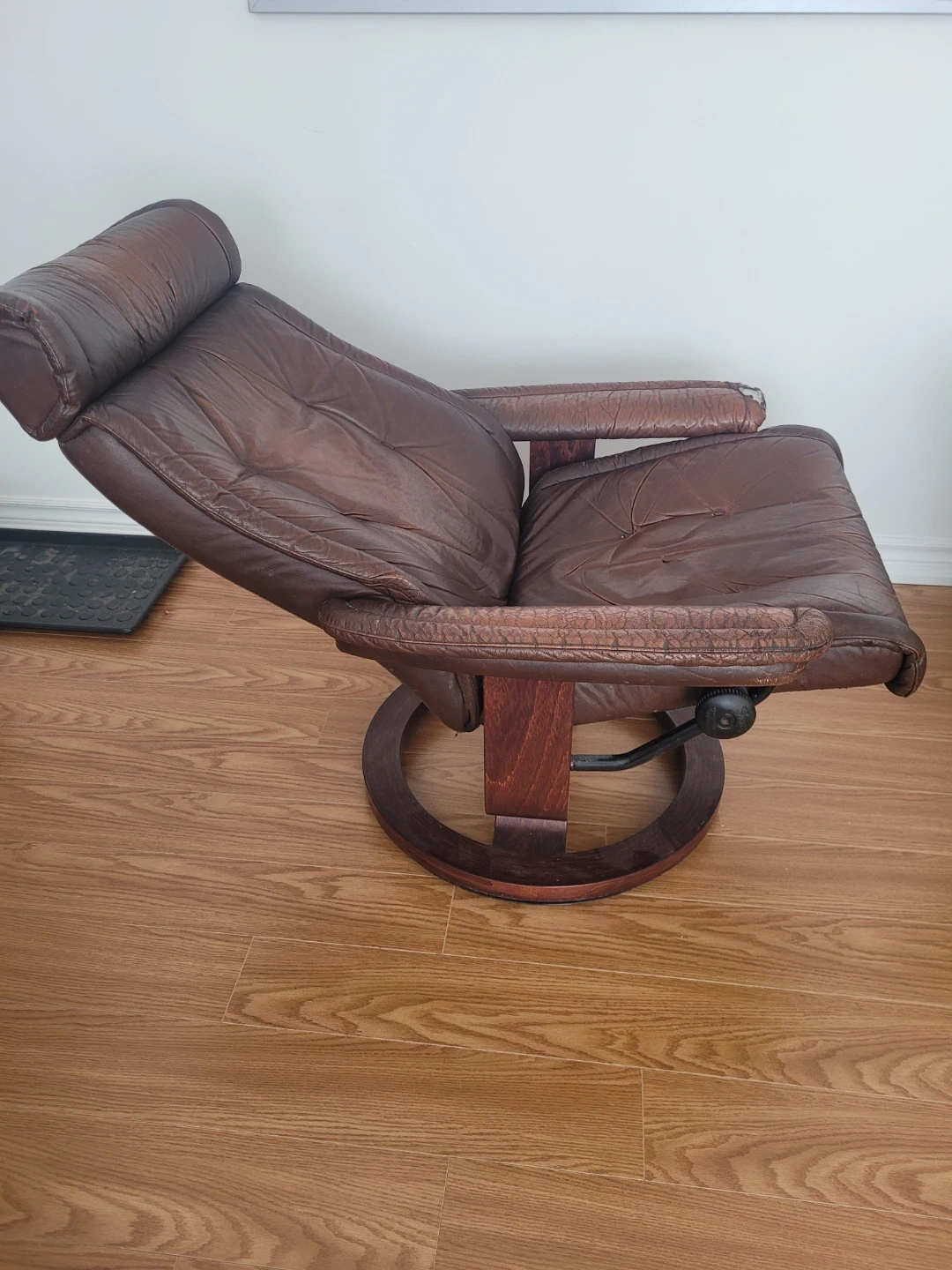 Vintage Ekornes Stressless swivel recliner. Made in Norway .Brown leather recliner chair with a swivel base. Shows some wear on the armrests and seat cushion. This chair is comfortable for relaxing.
