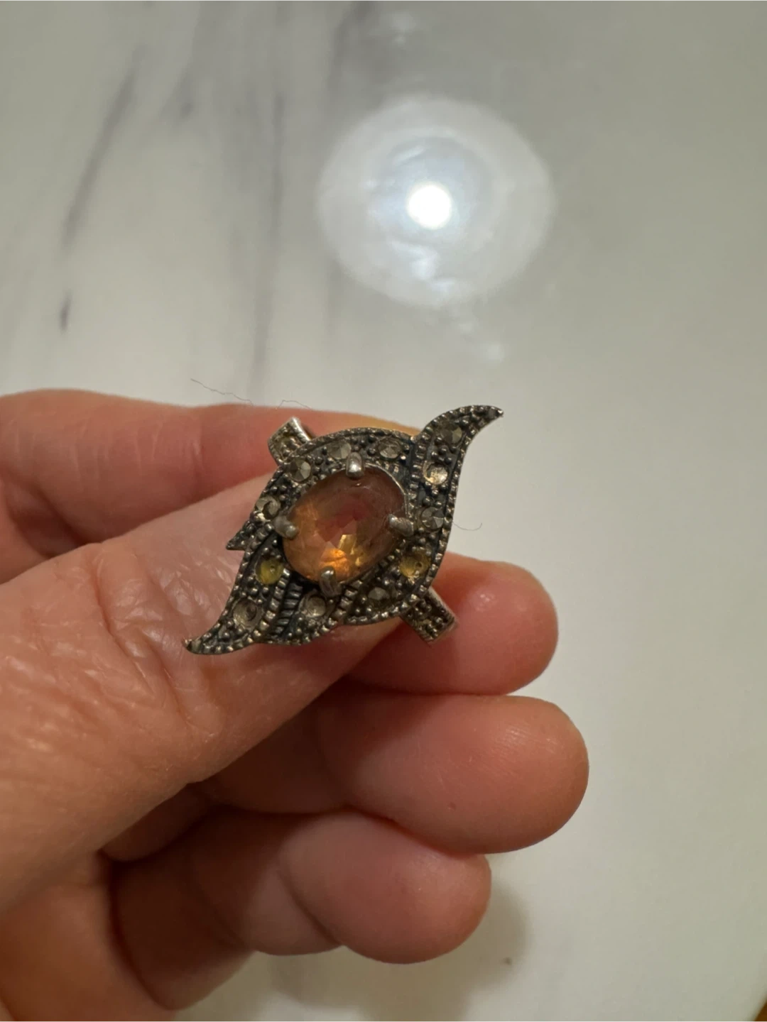 This is a beautiful vintage ring featuring a central garnet stone surrounded by marcasite accents. It has a unique leaf-like design. It change color under different lights. Color can be change brown, burgundy, yellow or pink . a lovely piece of statement jewelry.