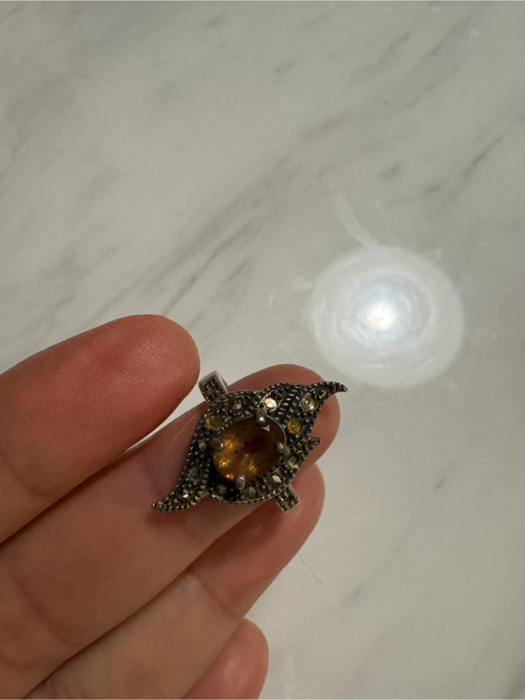 This is a beautiful vintage ring featuring a central garnet stone surrounded by marcasite accents. It has a unique leaf-like design. It change color under different lights. Color can be change brown, burgundy, yellow or pink . a lovely piece of statement jewelry.