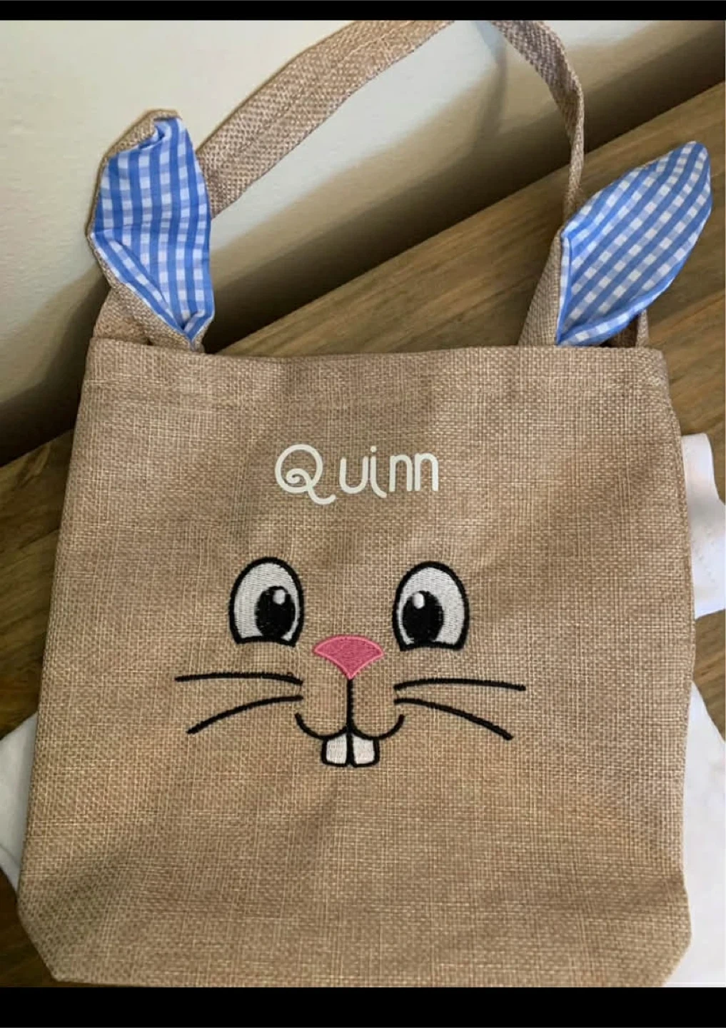 This is a cute burlap Easter bagwith a bunny face design. The bunny ears are lined with blue and white gingham fabric. It's perfect for collecting Easter eggs or carrying treats!