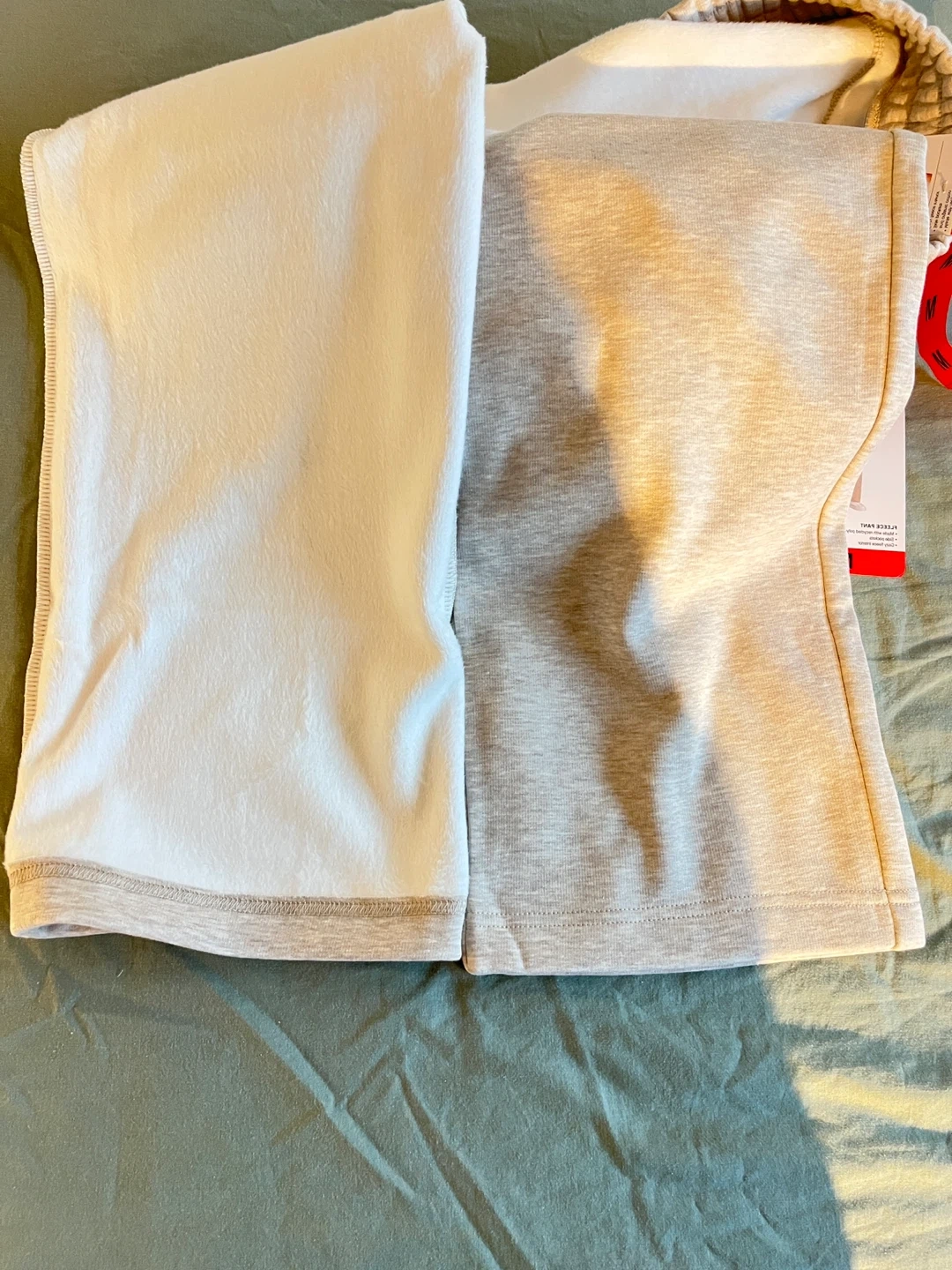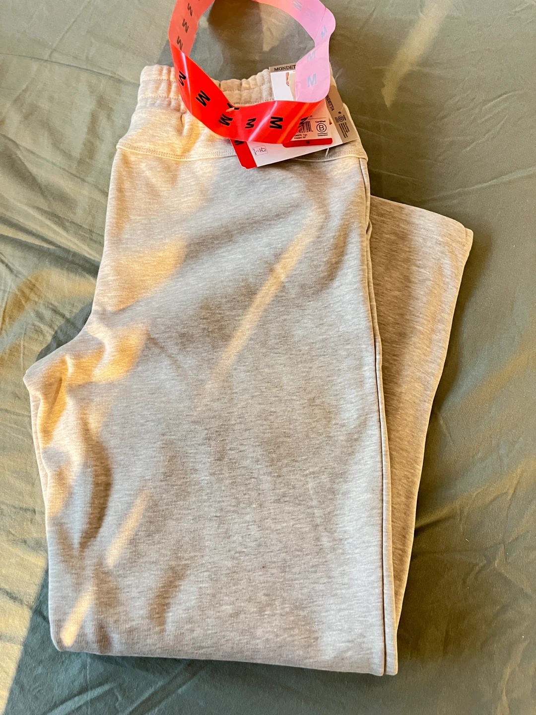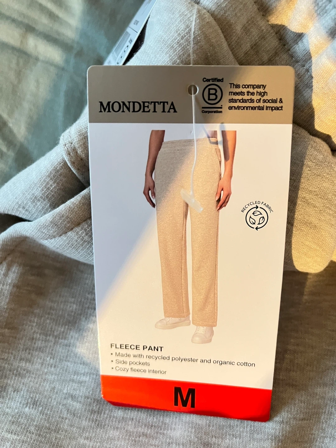 These Mondetta fleece pants are brand new with tags! They're a comfy neutral colour and size medium. Made with recycled polyester and organic cotton, they also have side pockets and a cozy fleece interio.