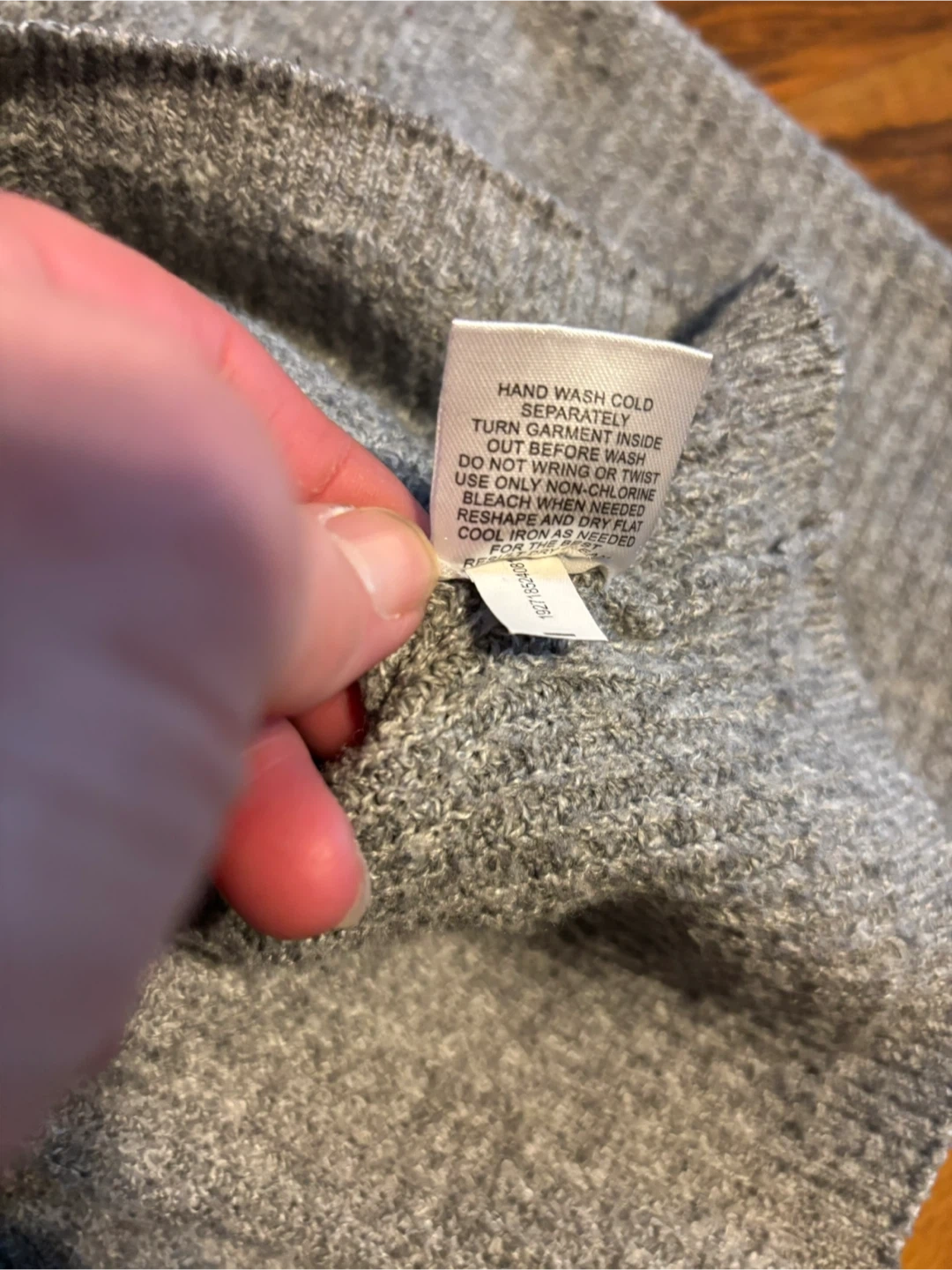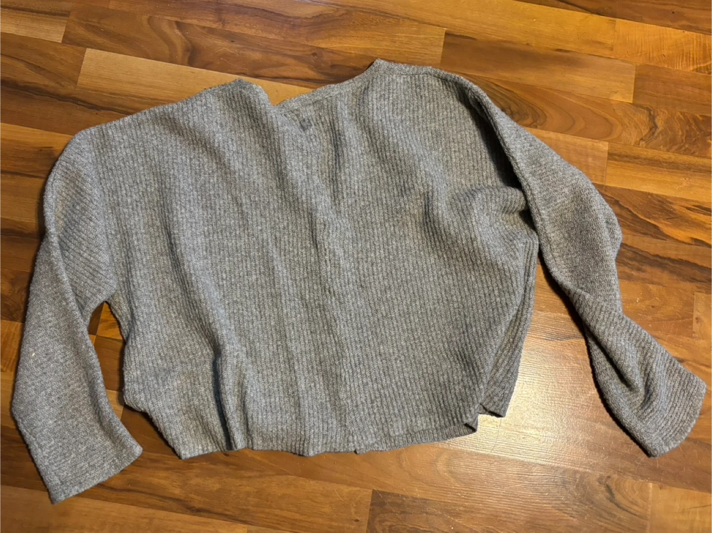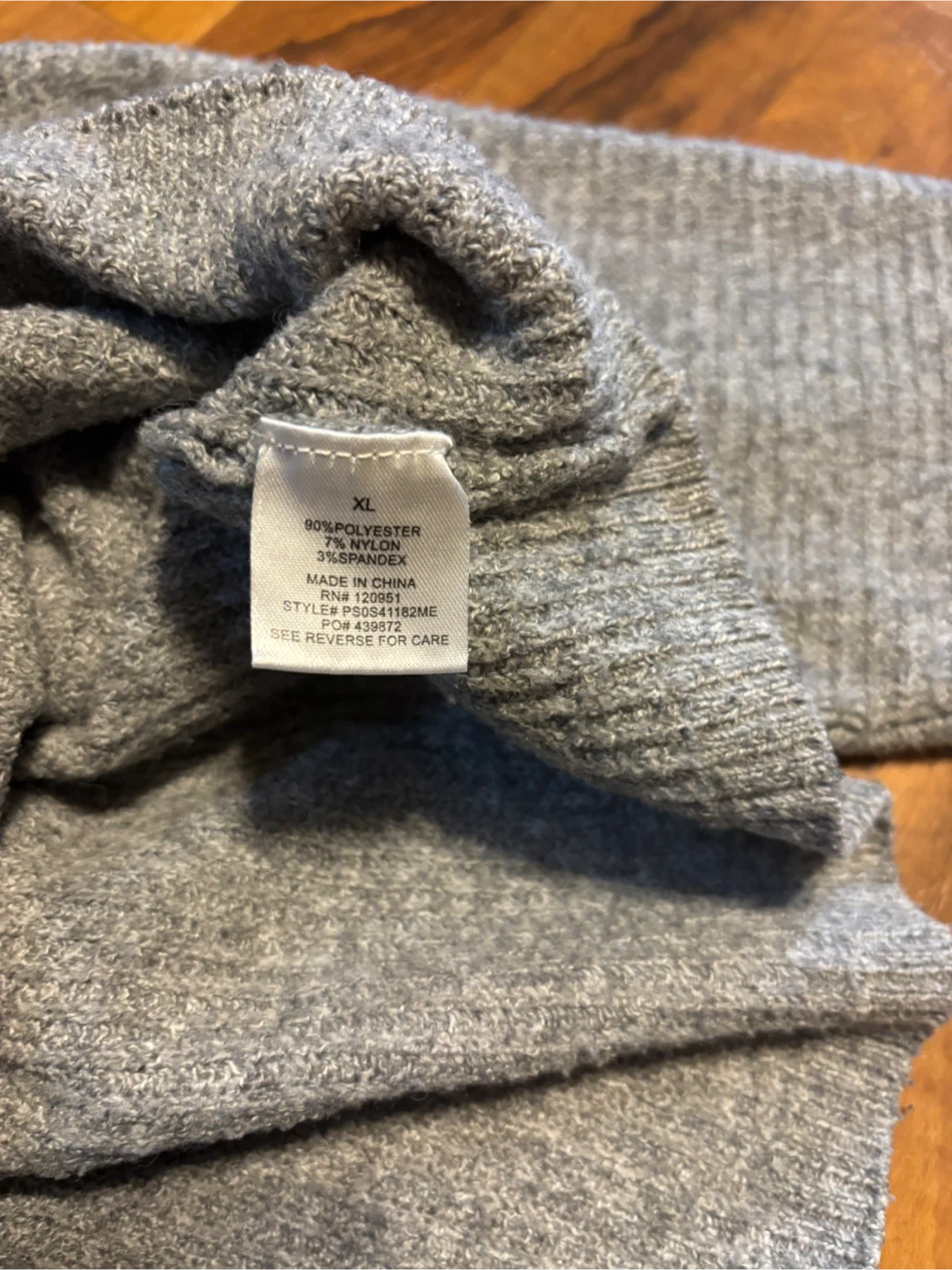 This is a gray knit cardigan sweater by Pink Rose. It's a size XL and made from 90% polyester, 7% nylon, and 3% spandex. Hand wash cold separately.