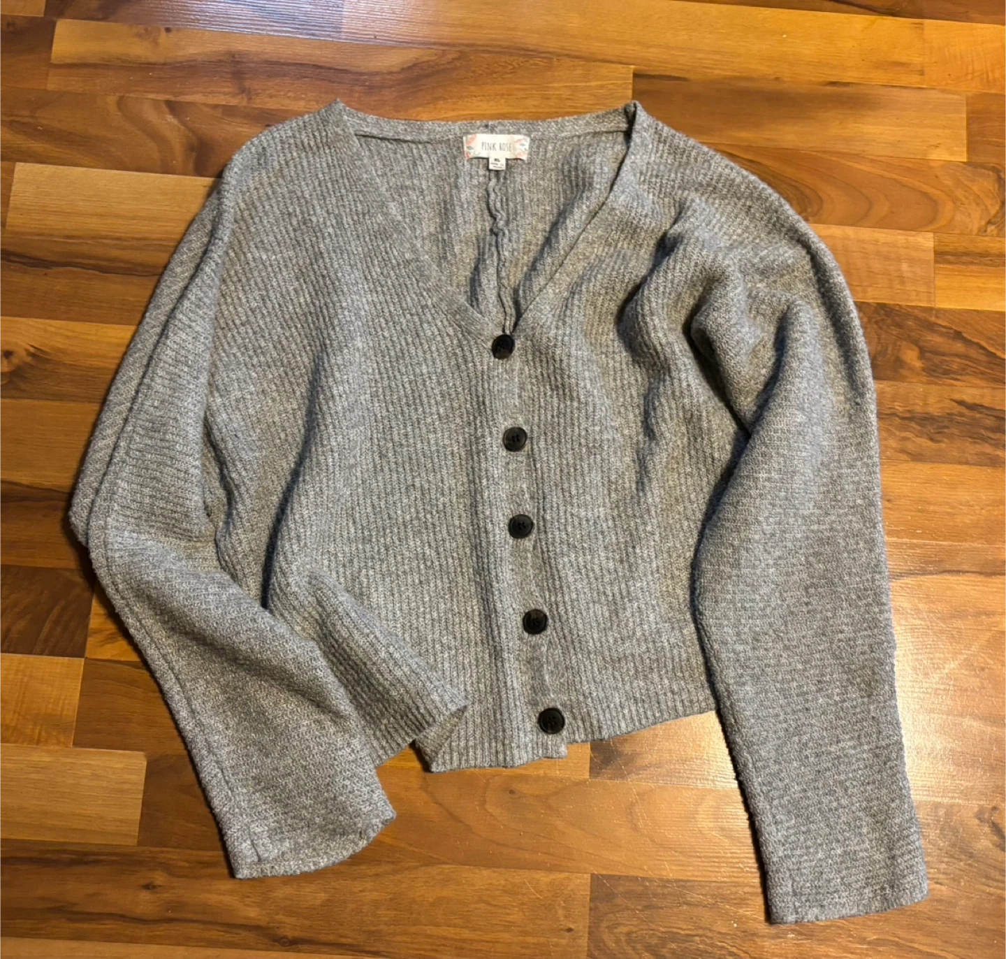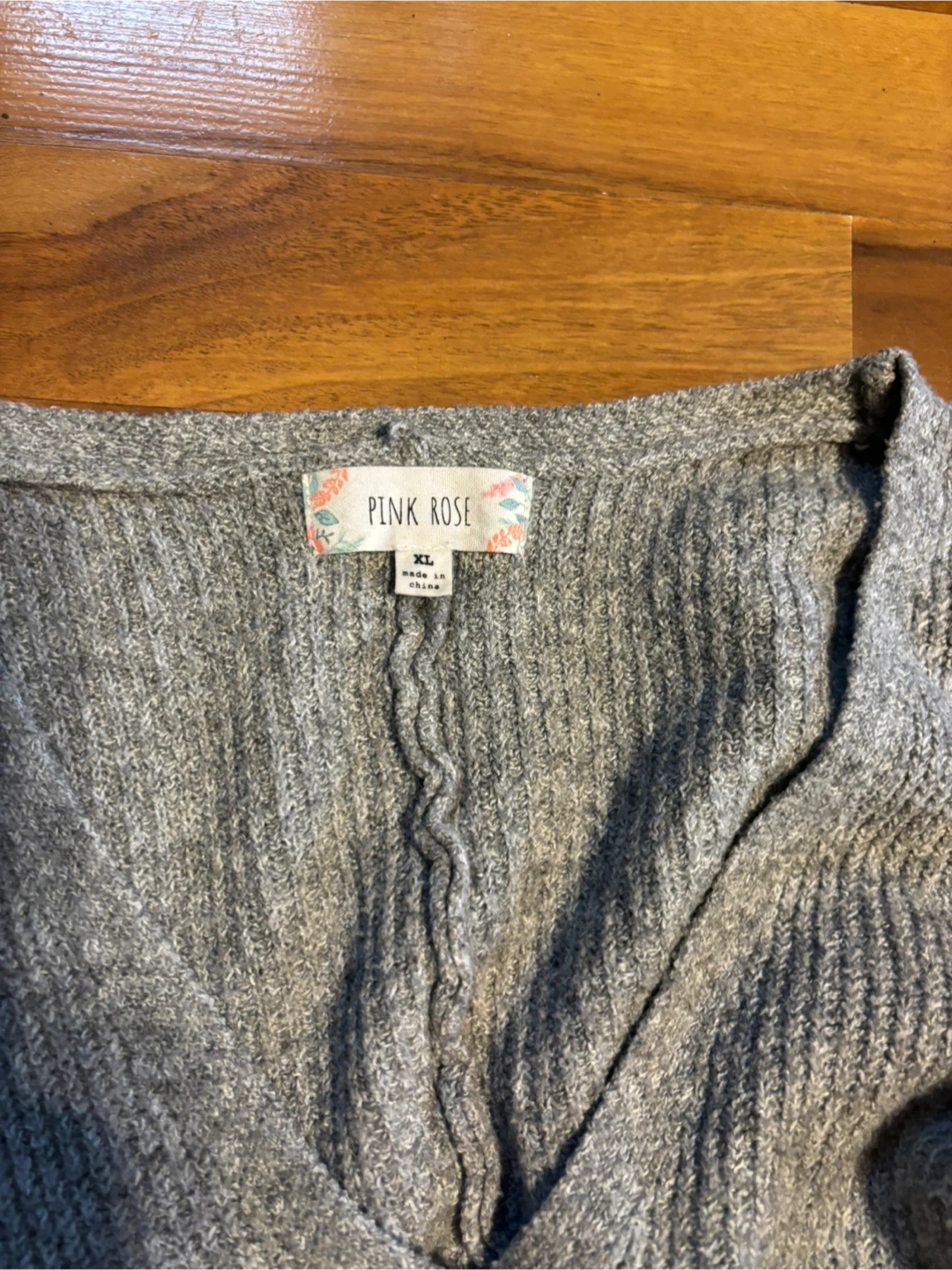 This is a gray knit cardigan sweater by Pink Rose. It's a size XL and made from 90% polyester, 7% nylon, and 3% spandex. Hand wash cold separately.