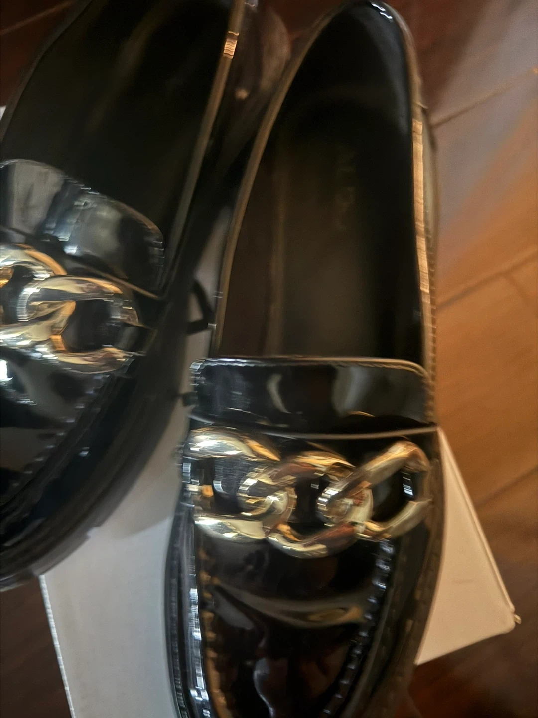 ALDO Black Patent Loafers with Gold Chain