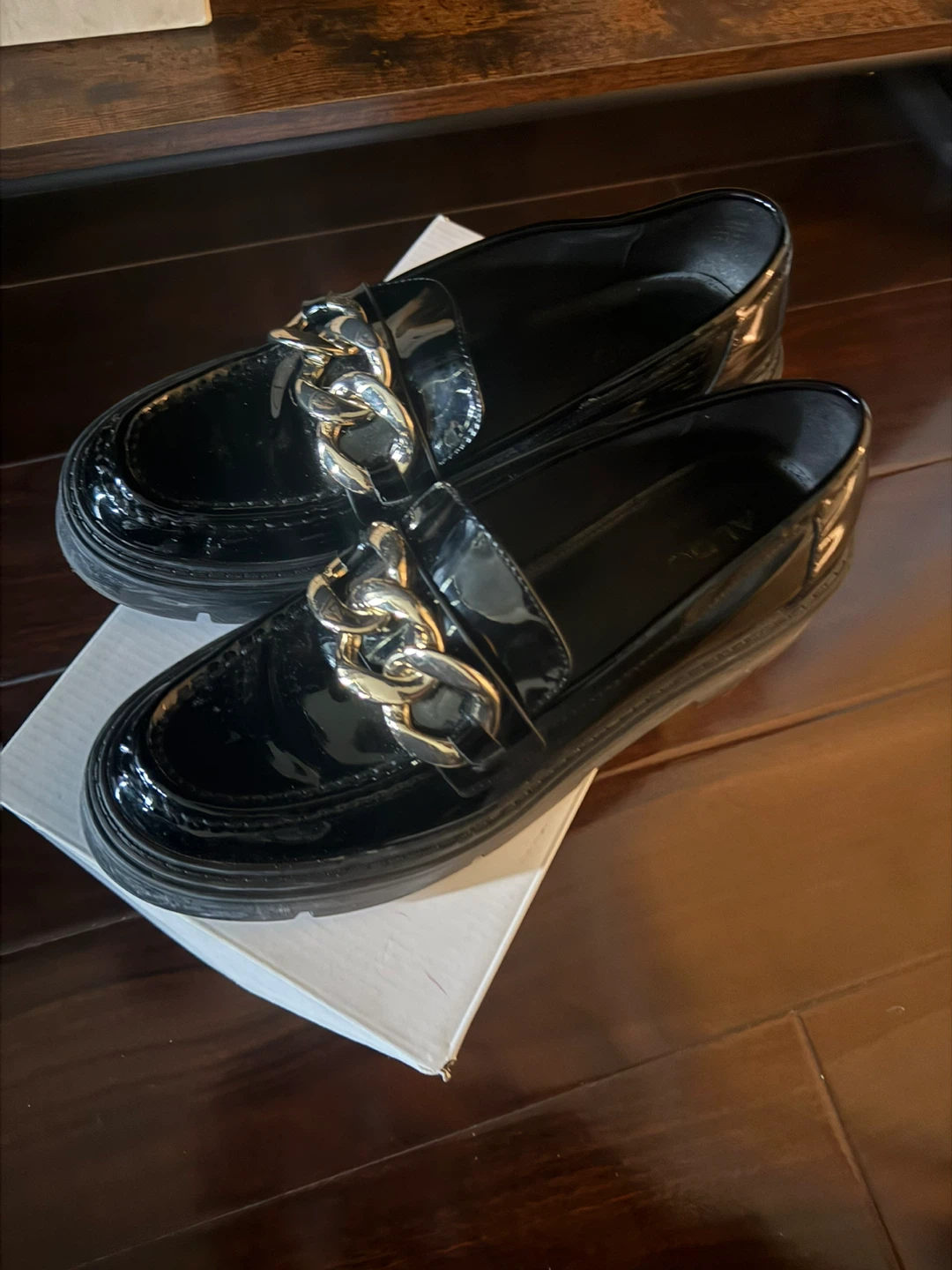 ALDO Black Patent Loafers with Gold Chain