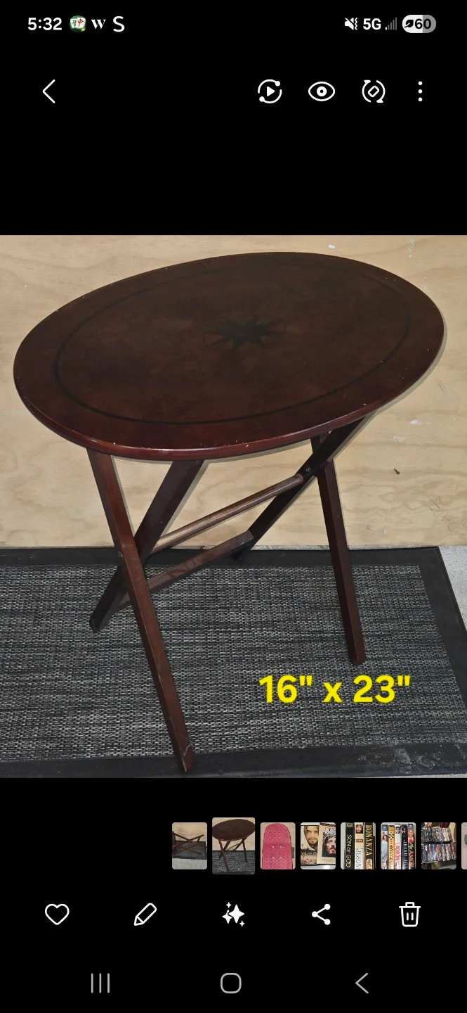 Buy & SellFolding Tray TableFolding Tray Table$20A dark wood folding tray table with a star design on top. It measures 16" x 23". This table is convenient for serving or as a side table.Dimensions16" x 23"WHERE TO MEETMc Donald'sView MapSELLERverifiedJavierKennedy Park1135 reviews1 chats·0 favorites·11 viewsSEND CHAT TO SELLERHi Javier! I’m interested in your listing.Hi Javier! I’m interested in your listing.Get the Karrot app to chatSign In to chat