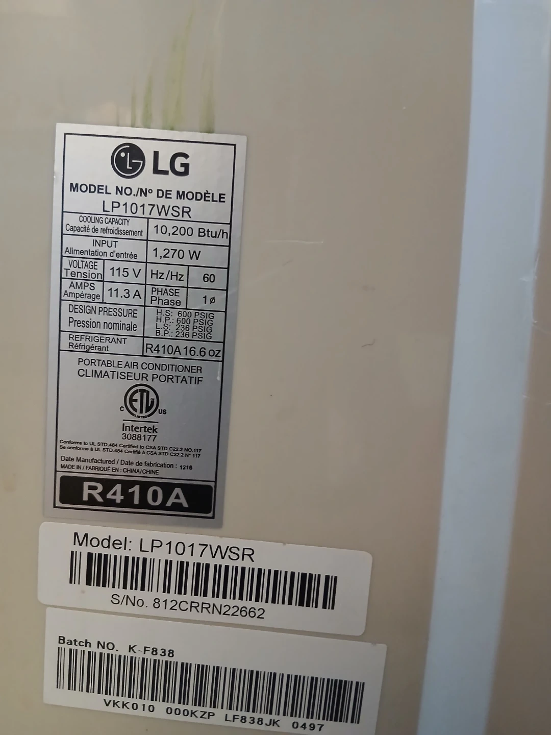 This is an LG portable air conditioner, model LP1017WSR. It has a cooling capacity of 10,200 BTU/h. It runs on 115 V, 60 Hz, and 11.3 A. The refrigerant is R410A.
