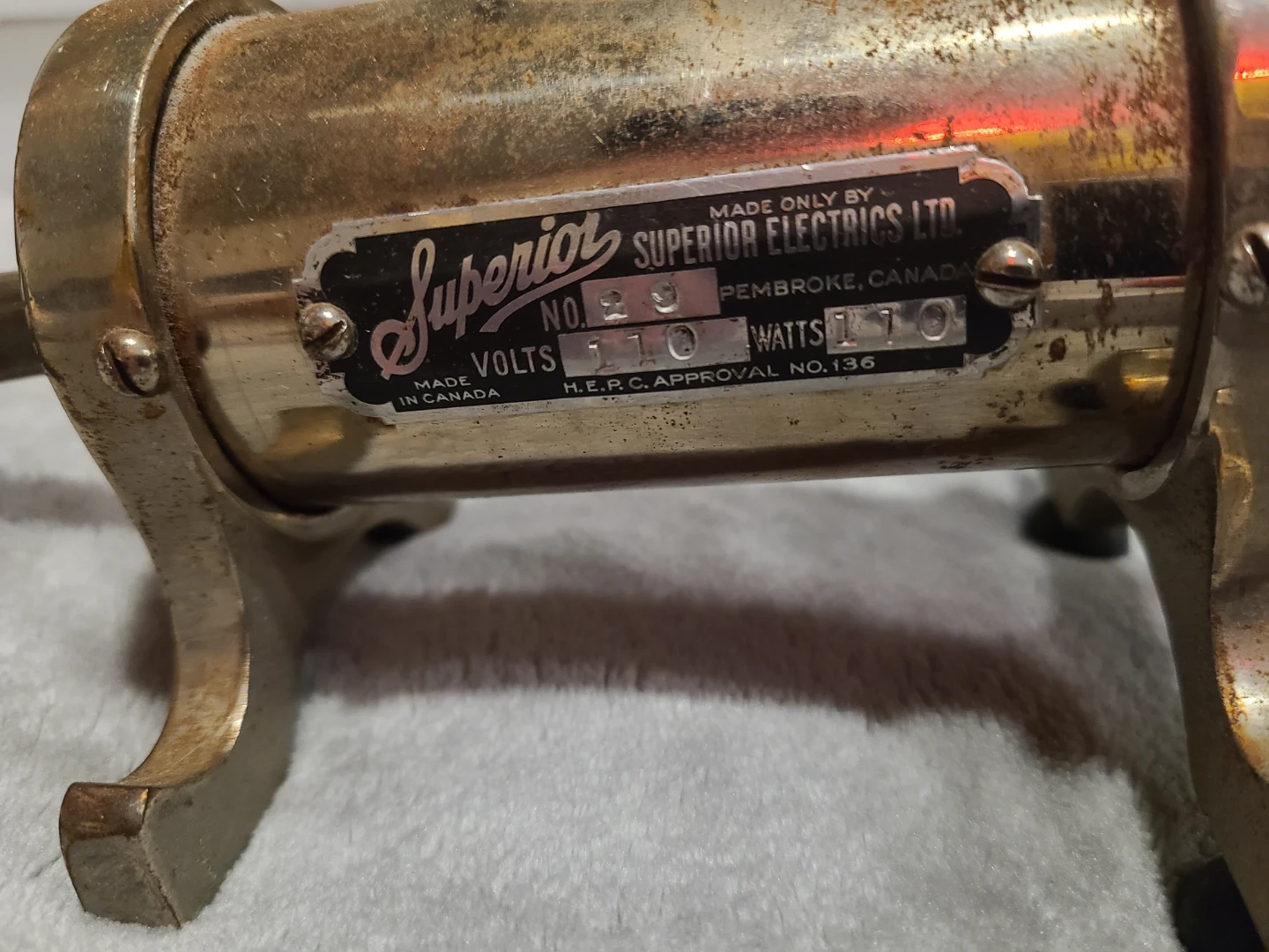 This is a vintage Superior Electric meat grinder/stuffer made in Canada. It's rated for 110 volts and 170 watts. This sturdy metal appliance is built to last!