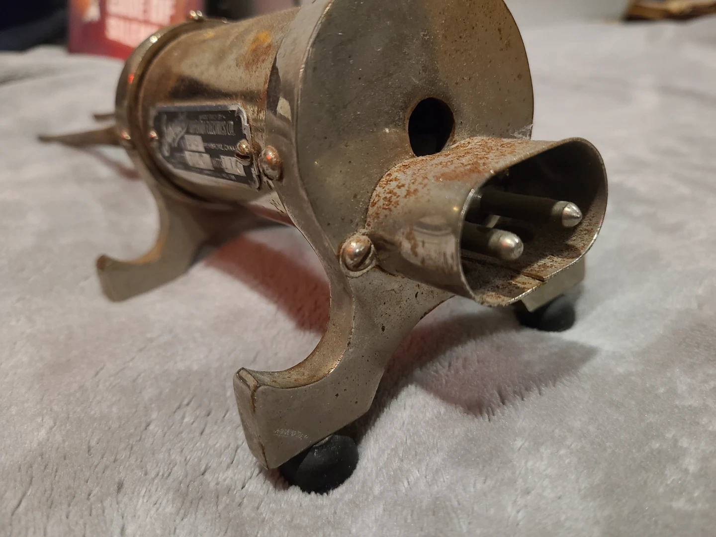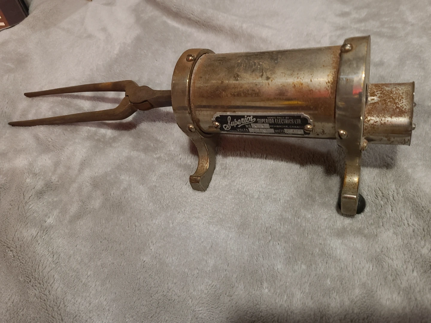 This is a vintage Superior Electric meat grinder/stuffer made in Canada. It's rated for 110 volts and 170 watts. This sturdy metal appliance is built to last!