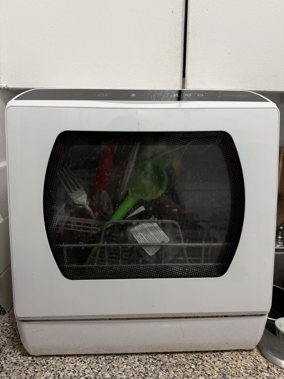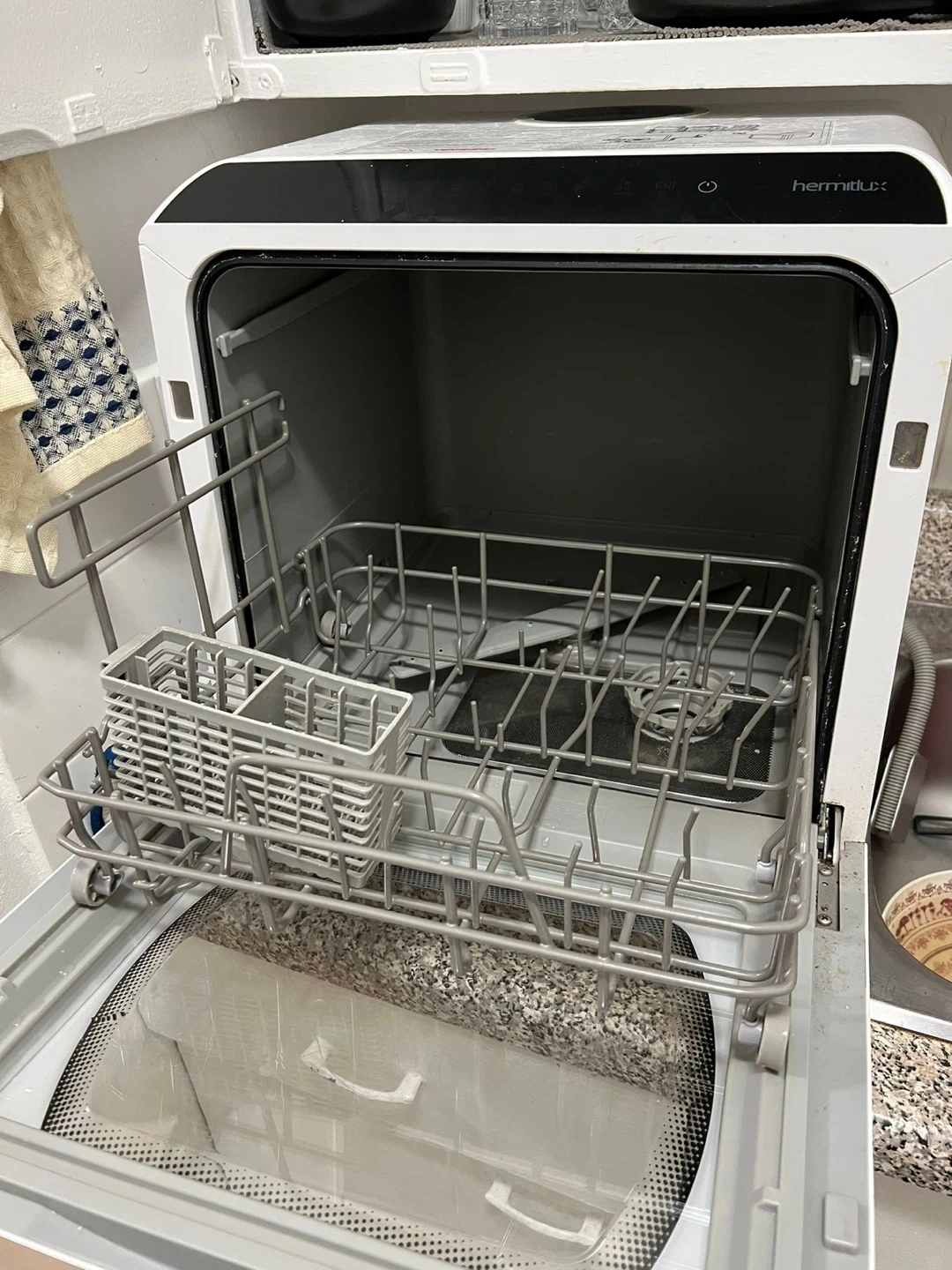 Hermic portable countertop dishwasher. It's white and compact for small kitchens. Amazing condition, works great.