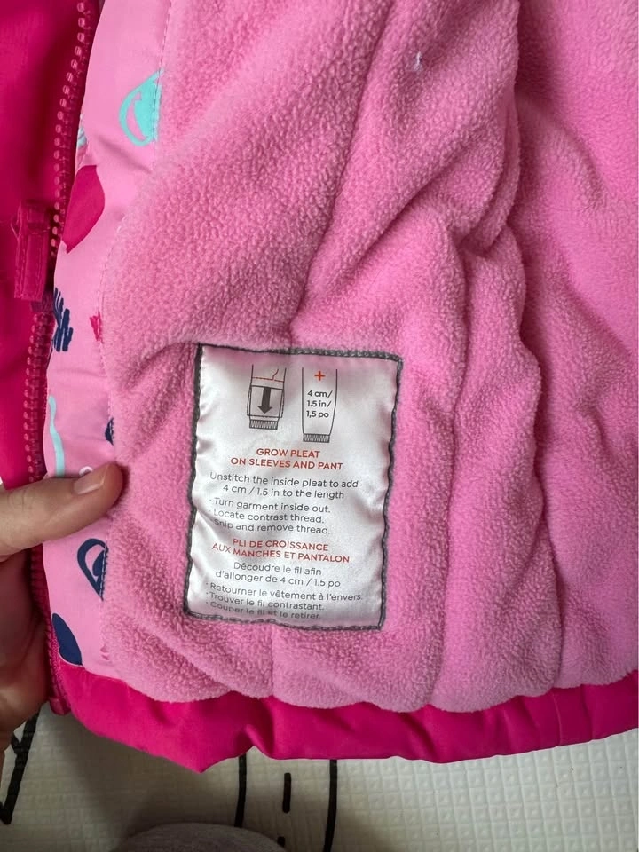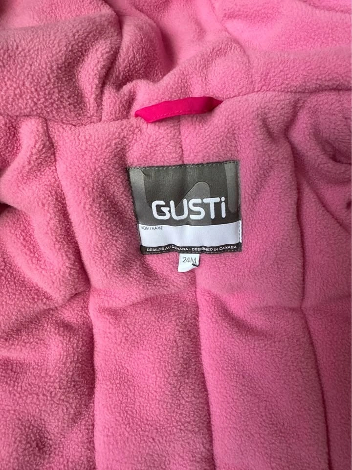 Bright pink Gusti 2-piece snowsuit, size 24M. Includes jacket and snow pants. Jacket has a cute heart pattern on top and cozy fleece lining. Features a grow pleat for extending sleeves and pants. No rips or stains. Pick up in Richmond Hill.