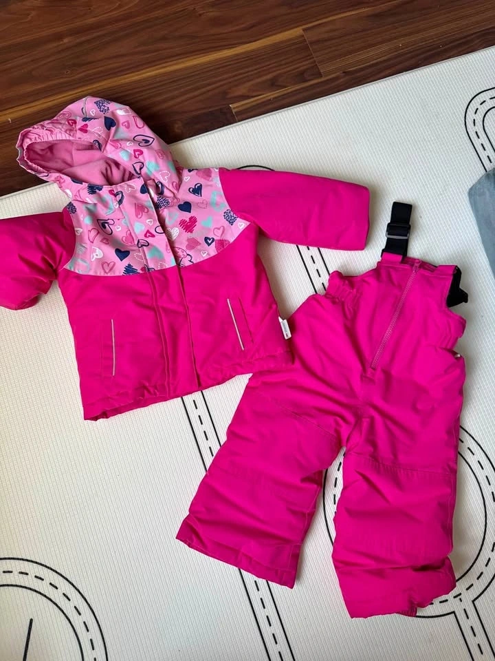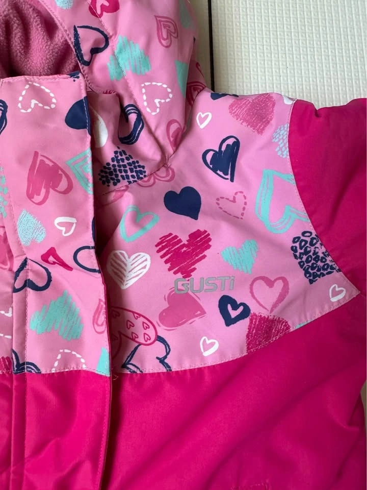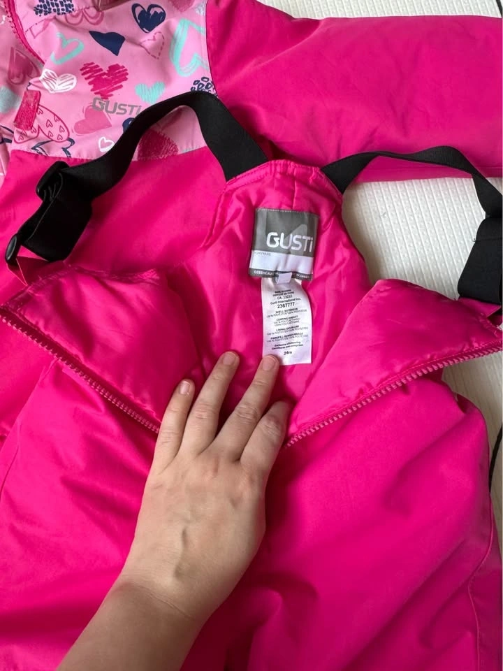 Bright pink Gusti 2-piece snowsuit, size 24M. Includes jacket and snow pants. Jacket has a cute heart pattern on top and cozy fleece lining. Features a grow pleat for extending sleeves and pants. No rips or stains. Pick up in Richmond Hill.