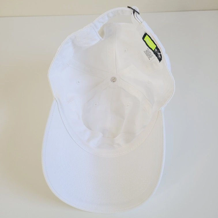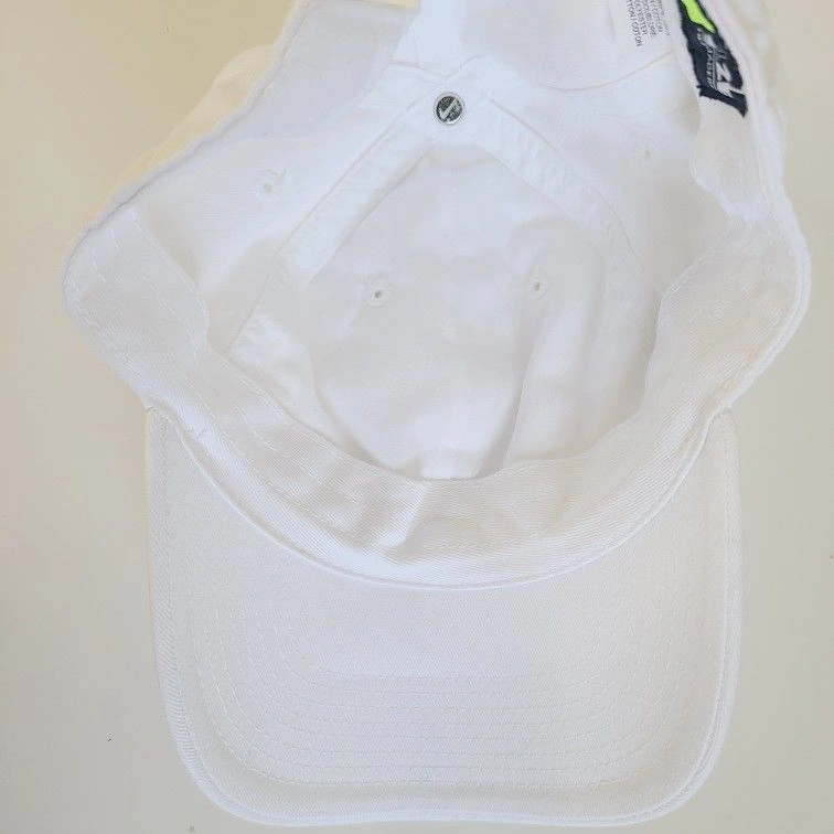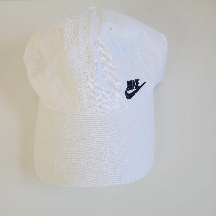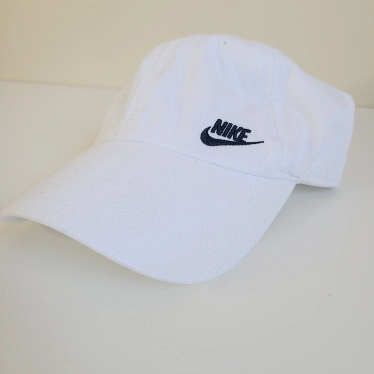 This Nike hat features a classic strap back design, perfect for casual wear. The embroidered black Swoosh on a white background adds a stylish touch. Adjustable fit ensures comfort for all-day wear. Good used condition, freshly washed.