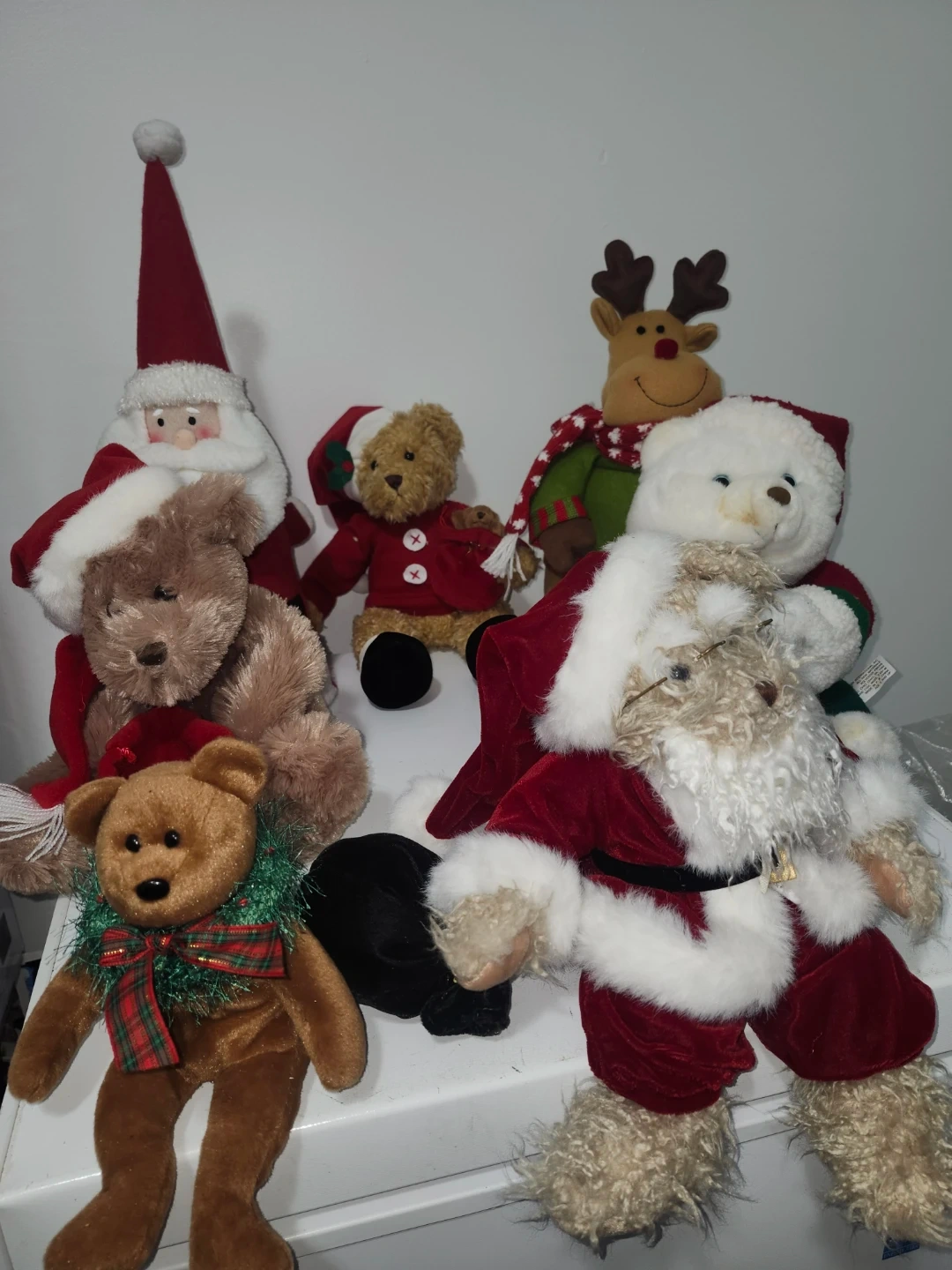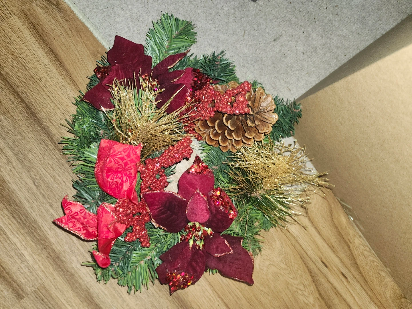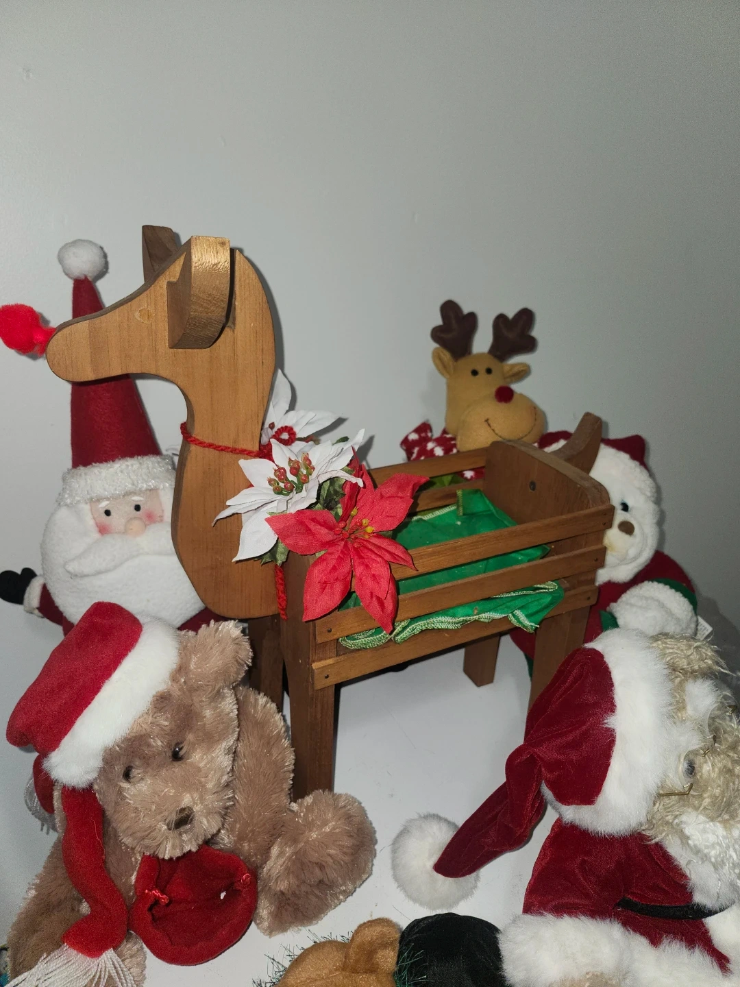 A festive collection of Christmas decorations including a pinecone and poinsettia arrangement, plush Santas and bears, and a wooden reindeer sleigh. Perfect for adding holiday cheer to your home!