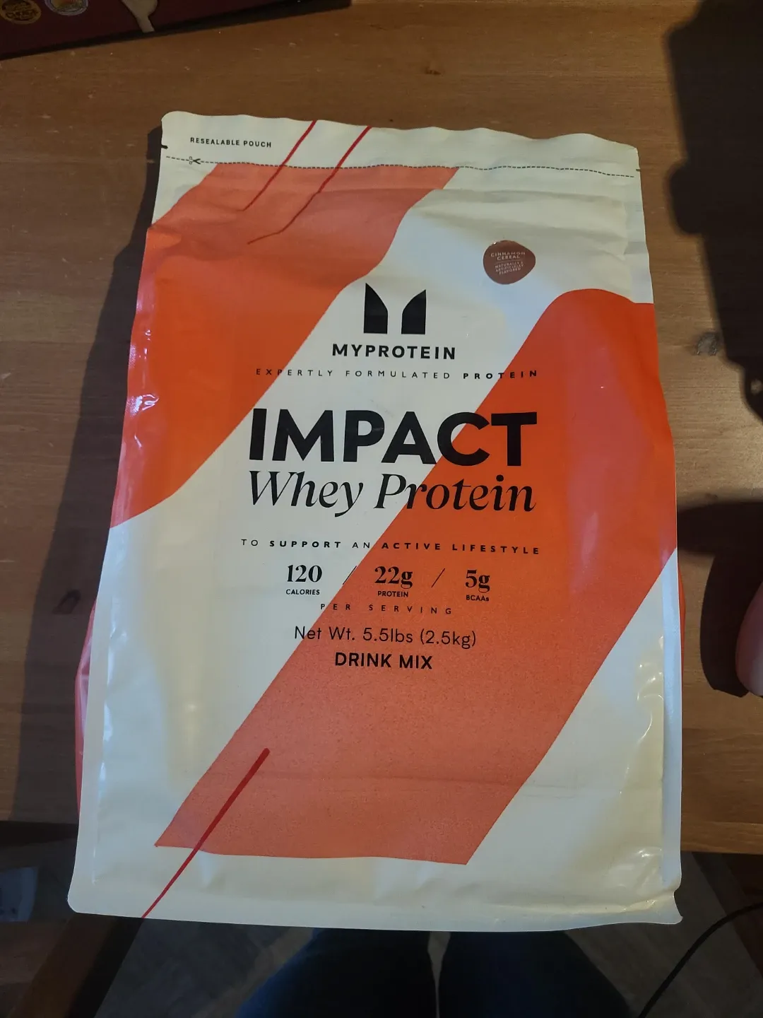 This is a 5.5lb (2.5kg) bag of MYPROTEIN Impact Whey Protein in Cinnamon Cereal flavour. 120 calories and 22g of protein per serving.