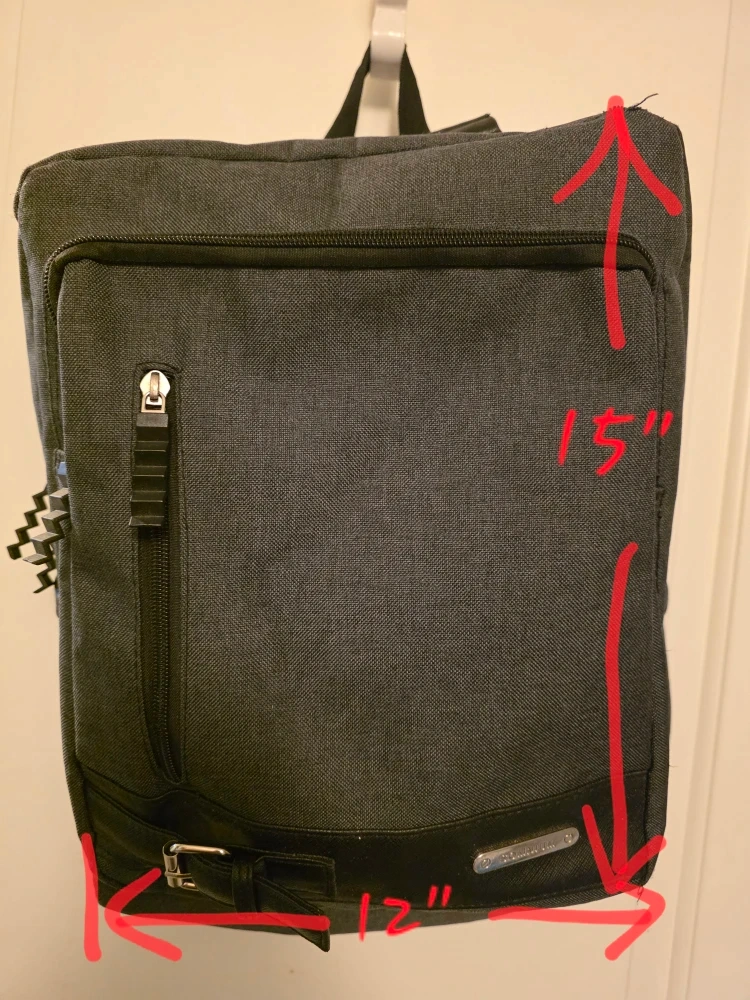This is backpack in gray. It measures approximately 15 inches in height and 12 inches in width. Great for carrying books or a laptop!