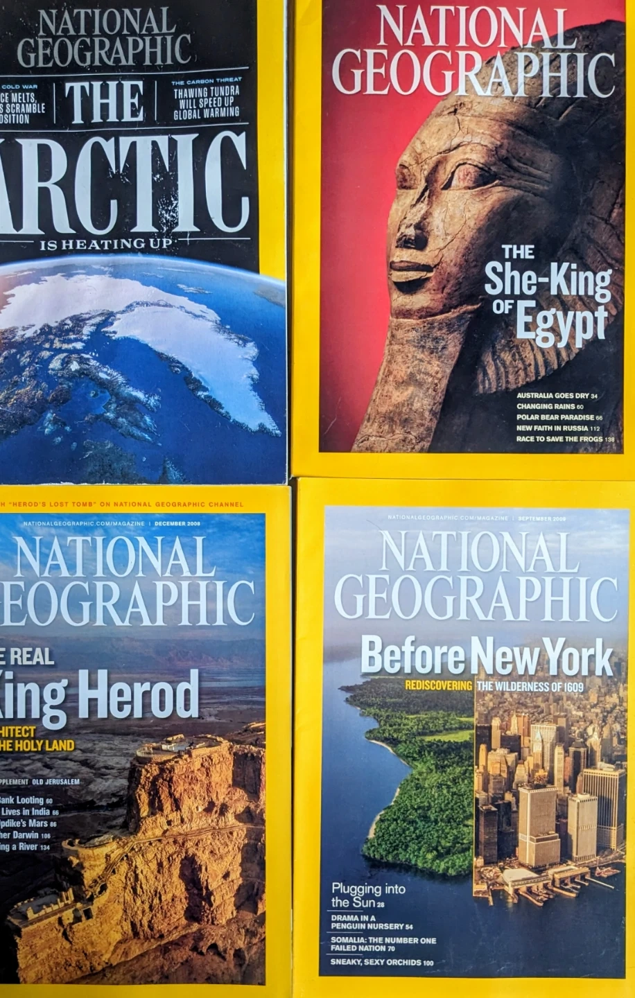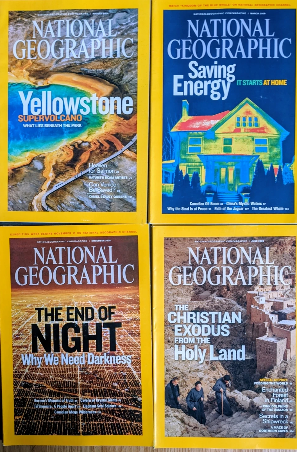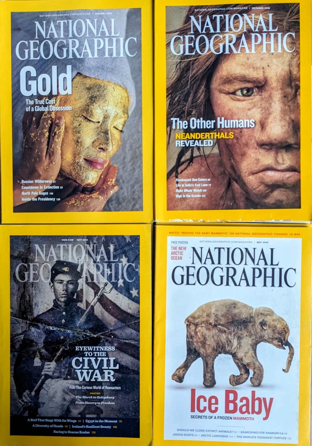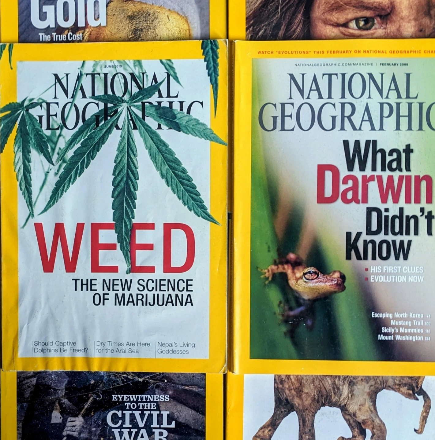 National Geographic magazines are included. Issues cover topics like Yellowstone, saving energy, the end of night, and Christian exodus from the Holy Land. Other included topics are "Weed: The New Science of Marijuana", "What Darwin Didn't Know", "Gold: The True Cost of a Global Obsession", and "The Other Humans: Neanderthals Revealed".